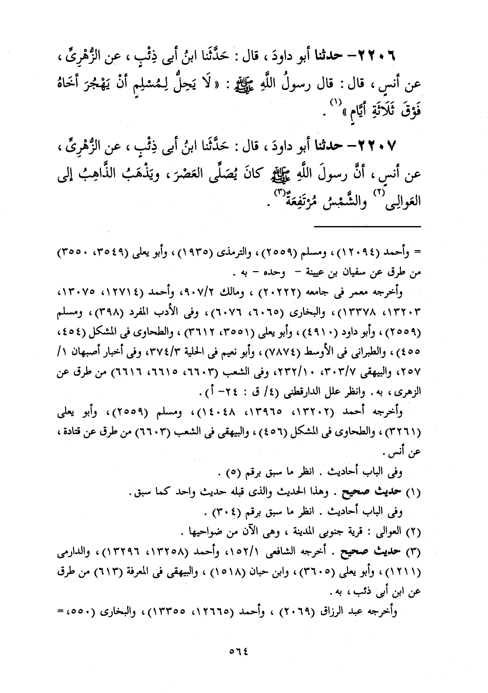 2206 - حَدَّثَنَا أَبُو دَاوُدَ قَالَ: حَدَّثَنَا ابْنُ أَبِي ذِئْبٍ، عَنِ الزُّهْرِيِّ، عَنْ أَنَسٍ، قَالَ: قَالَ رَسُولُ اللَّهِ صَلَّى اللهُ عَلَيْهِ وَسَلَّمَ: «§لَا يَحِلُّ لِمُسْلِمٍ أَنْ يَهْجُرَ أَخَاهُ فَوْقَ ثَلَاثَةِ أَيَّامٍ»