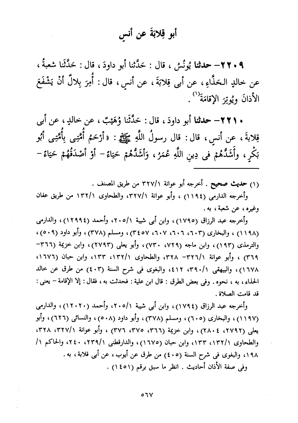 2209 - حَدَّثَنَا يُونُسُ قَالَ: حَدَّثَنَا أَبُو دَاوُدَ قَالَ: حَدَّثَنَا شُعْبَةُ، عَنْ خَالِدٍ الْحَذَّاءِ، عَنْ أَبِي قِلَابَةَ، عَنْ أَنَسٍ، قَالَ: «أُمِرَ بِلَالٌ أَنْ §يَشْفَعَ الْأَذَانَ وَيُوتِرَ الْإِقَامَةَ»