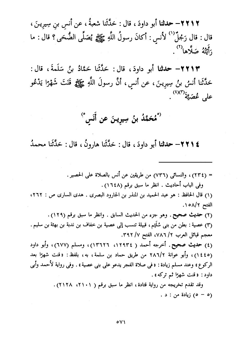 2213 - حَدَّثَنَا أَبُو دَاوُدَ قَالَ: حَدَّثَنَا حَمَّادُ بْنُ سَلَمَةَ، قَالَ: حَدَّثَنَا أَنَسُ بْنُ سِيرِينَ، عَنْ أَنَسٍ، أَنَّ رَسُولَ اللَّهِ صَلَّى اللهُ عَلَيْهِ وَسَلَّمَ «§قَنَتَ شَهْرًا يَدْعُو عَلَى عُصَيَّةَ»