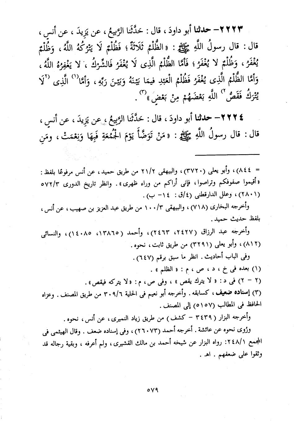 2223 - حَدَّثَنَا أَبُو دَاوُدَ قَالَ: حَدَّثَنَا الرَّبِيعُ، عَنْ يَزِيدَ، عَنْ أَنَسٍ، قَالَ: قَالَ رَسُولُ اللَّهِ صَلَّى اللهُ عَلَيْهِ وَسَلَّمَ: " §الظُّلْمُ ثَلَاثَةٌ: فَظُلْمٌ لَا يَتْرُكُهُ اللَّهُ، وَظُلْمٌ يُغْفَرُ، وَظُلْمٌ لَا يُغْفَرُ، فَأَمَّا الظُّلْمُ الَّذِي لَا يُغْفَرُ فَالشِّرْكُ لَا يَغْفِرُهُ اللَّهُ، وَأَمَّا الظُّلْمُ الَّذِي يُغْفَرُ فَظُلْمُ الْعَبْدِ فِيمَا بَيْنَهُ وَبَيْنَ رَبِّهِ، وَأَمَّا الَّذِي لَا يُتْرَكُ فَقَصُّ اللَّهِ بَعْضُهُمْ مِنْ بَعْضٍ "
