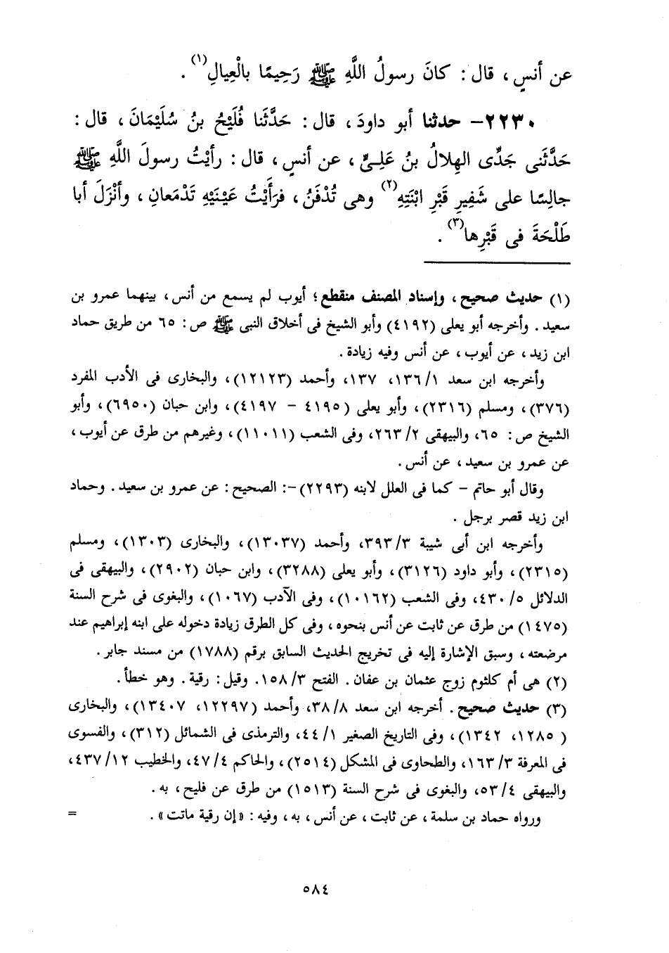 2230 - حَدَّثَنَا أَبُو دَاوُدَ قَالَ: حَدَّثَنَا فُلَيْحُ بْنُ سُلَيْمَانَ، قَالَ: حَدَّثَنِي جَدِّي الْهِلَالُ بْنُ عَلِيٍّ عَنْ أَنَسٍ، قَالَ: «§رَأَيْتُ رَسُولَ اللَّهِ صَلَّى اللهُ عَلَيْهِ وَسَلَّمَ جَالِسًا عَلَى شَفِيرِ قَبْرِ ابْنَتِهِ وَهِيَ تُدْفَنُ، فَرَأَيْتُ عَيْنَيْهَ تَدْمَعَانِ، وَأَنْزَلَ أَبَا طَلْحَةَ فِي قَبْرِهَا»