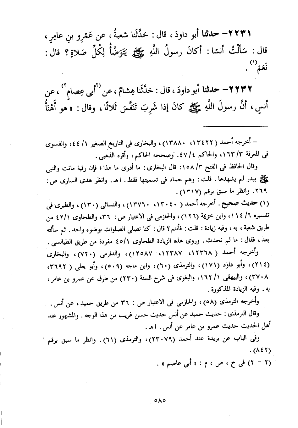 2231 - حَدَّثَنَا أَبُو دَاوُدَ قَالَ: حَدَّثَنَا شُعْبَةُ، عَنْ عَمْرِو بْنِ عَامِرٍ، قَالَ: سَأَلْتُ أَنَسًا: §أَكَانَ رَسُولُ اللَّهِ صَلَّى اللهُ عَلَيْهِ وَسَلَّمَ يَتَوَضَّأُ لِكُلِّ صَلَاةٍ؟ قَالَ: «نَعَمْ»