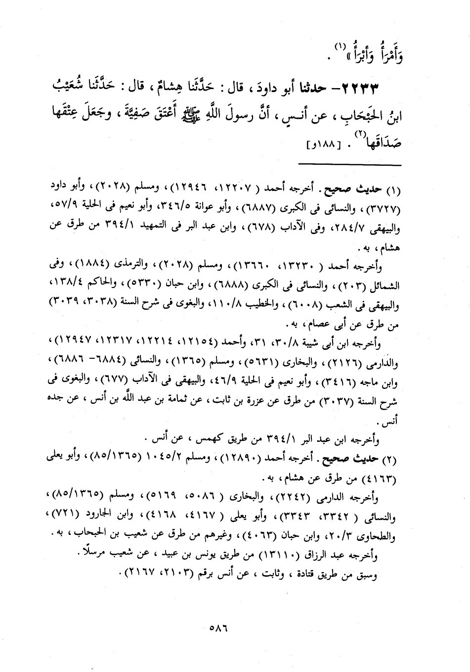 2233 - حَدَّثَنَا أَبُو دَاوُدَ قَالَ: حَدَّثَنَا هِشَامٌ، قَالَ: حَدَّثَنَا شُعَيْبُ بْنُ الْحَبْحَابِ، عَنْ أَنَسٍ، أَنَّ رَسُولَ اللَّهِ صَلَّى اللهُ عَلَيْهِ وَسَلَّمَ «§أَعْتَقَ صَفِيَّةَ وَجَعَلَ عِتْقَهَا صَدَاقَهَا»