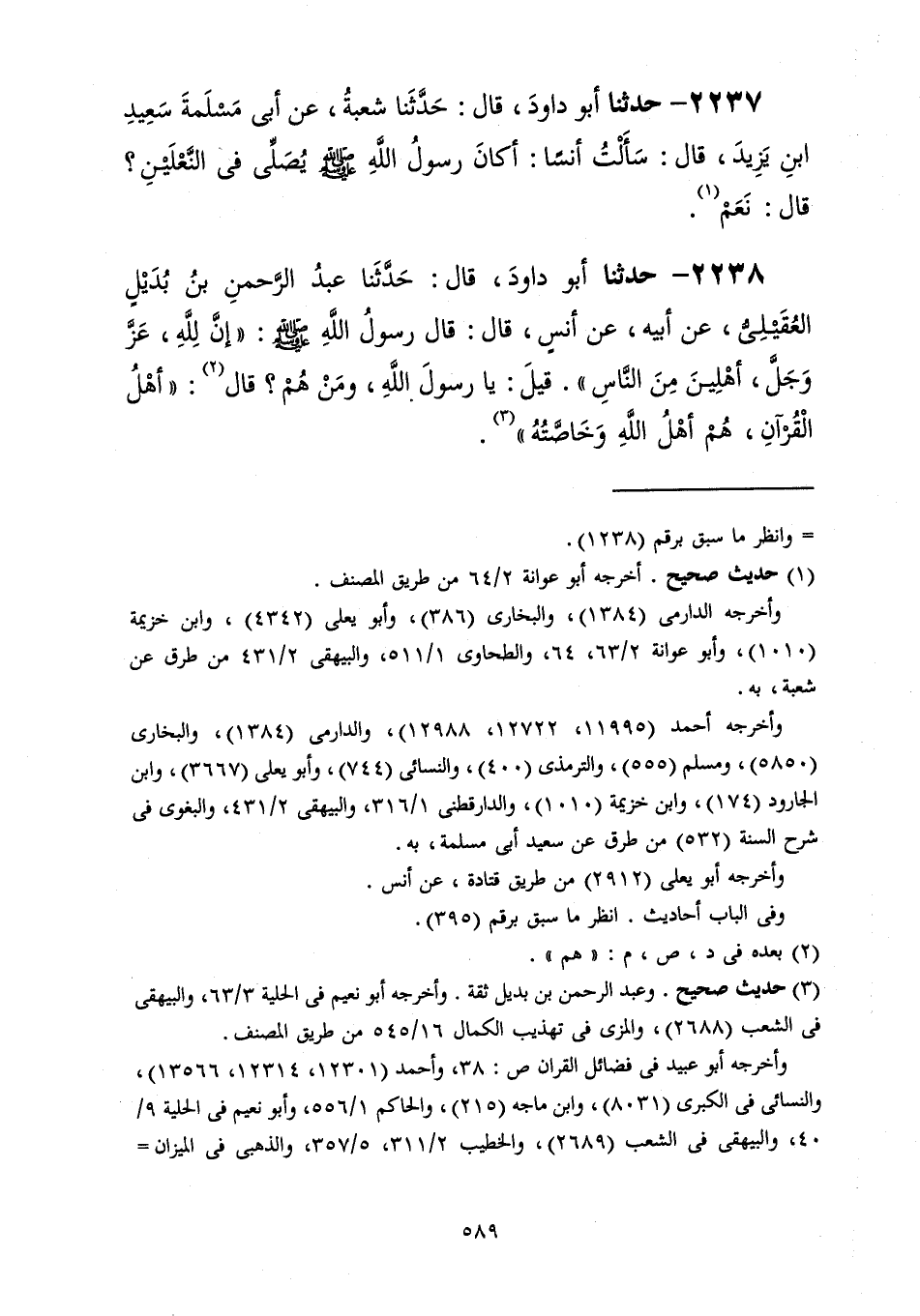 2237 - حَدَّثَنَا أَبُو دَاوُدَ قَالَ: حَدَّثَنَا شُعْبَةُ، عَنْ أَبِي مَسْلَمَةَ سَعِيدِ بْنِ يَزِيدَ، قَالَ: سَأَلْتُ أَنَسًا: §أَكَانَ رَسُولُ اللَّهِ صَلَّى اللهُ عَلَيْهِ وَسَلَّمَ يُصَلِّي فِي النَّعْلَيْنِ؟ قَالَ: «نَعَمْ»