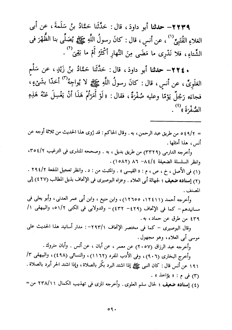 2240 - حَدَّثَنَا أَبُو دَاوُدَ قَالَ: حَدَّثَنَا حَمَّادُ بْنُ زَيْدٍ، عَنْ سَلْمٍ الْعَلَوِيِّ، عَنْ أَنَسٍ، قَالَ: كَانَ رَسُولُ اللَّهِ صَلَّى اللهُ عَلَيْهِ وَسَلَّمَ لَا يُوَاجِهُ أَحَدًا بِشَيْءٍ، فَجَاءَهُ رَجُلٌ يَوْمًا وَعَلَيْهِ صُفْرَةٌ، فَقَالَ: «§لَوْ أَمَرْتُمْ هَذَا أَنْ يَغْسِلَ عَنْهُ هَذِهِ الصُّفْرَةَ»