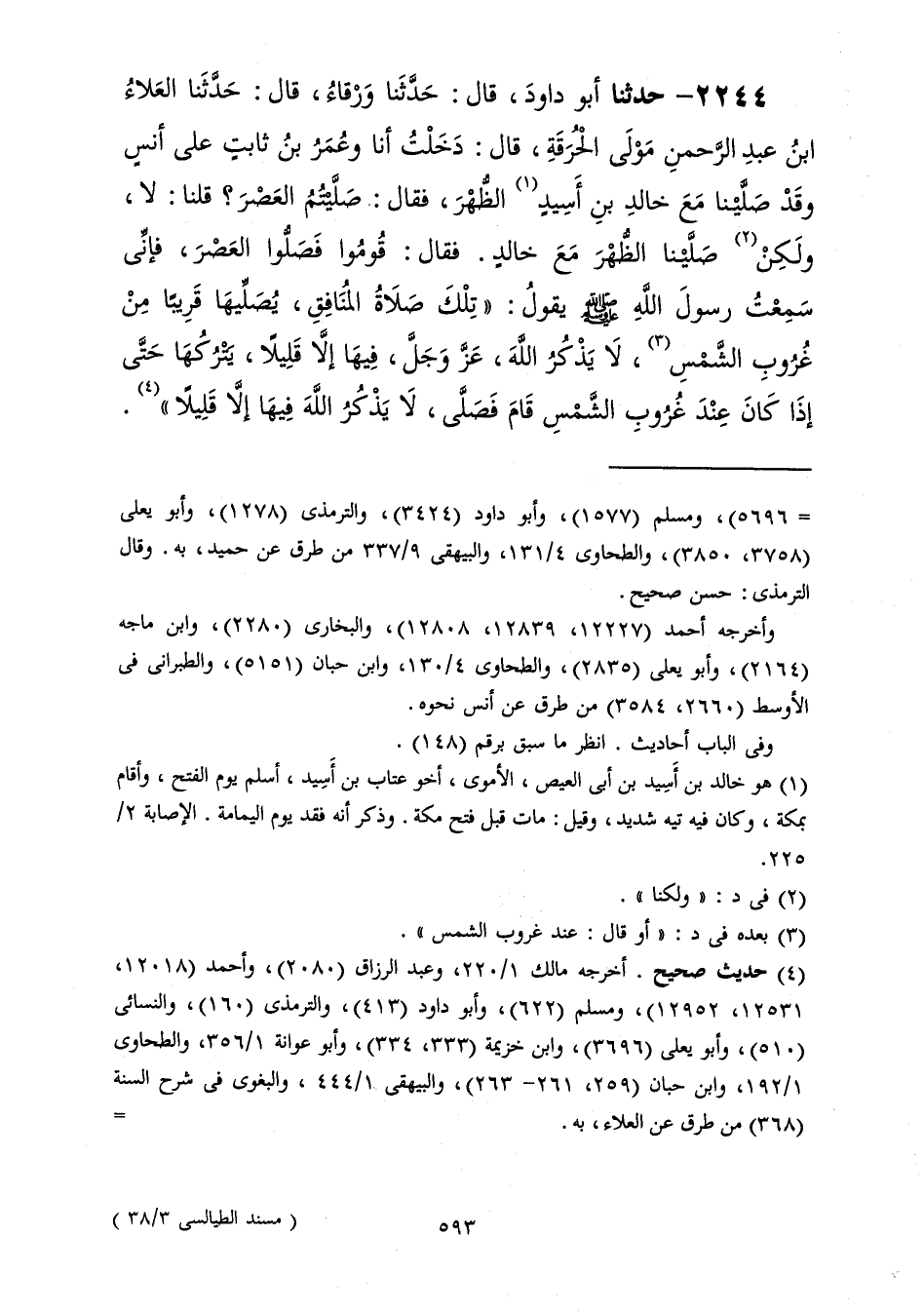 2244 - حَدَّثَنَا أَبُو دَاوُدَ قَالَ: حَدَّثَنَا وَرْقَاءُ، قَالَ: حَدَّثَنَا الْعَلَاءُ بْنُ عَبْدِ الرَّحْمَنِ، مَوْلَى الْحُرَقَةِ، قَالَ: دَخَلْتُ أَنَا وَعُمَرُ بْنُ ثَابِتٍ، عَلَى أَنَسٍ وَقَدْ صَلَّيْنَا مَعَ خَالِدِ بْنِ أَسِيدٍ الظُّهْرَ، فَقَالَ: صَلَّيْتُمُ الْعَصْرَ، قُلْنَا: لَا، وَلَكِنْ صَلَّيْنَا الظُّهْرَ مَعَ خَالِدٍ، فَقَالَ: قُومُوا، فَصَلُّوا الْعَصْرَ، فَإِنِّي سَمِعْتُ رَسُولَ اللَّهِ صَلَّى اللهُ عَلَيْهِ وَسَلَّمَ يَقُولُ: «§تِلْكَ صَلَاةُ الْمُنَافِقِ، يُصَلِّيَهَا قَرِيبًا مِنْ غُرُوبِ الشَّمْسِ، لَا يَذْكُرُ اللَّهَ عَزَّ وَجَلَّ فِيهَا إِلَّا قَلِيلًا، يَتْرُكُهَا حَتَّى إِذَا كَانَ عِنْدَ غُرُوبِ الشَّمْسِ، قَامَ فَصَلَّى لَا يَذْكُرُ اللَّهَ فِيهَا إِلَّا قَلِيلًا»