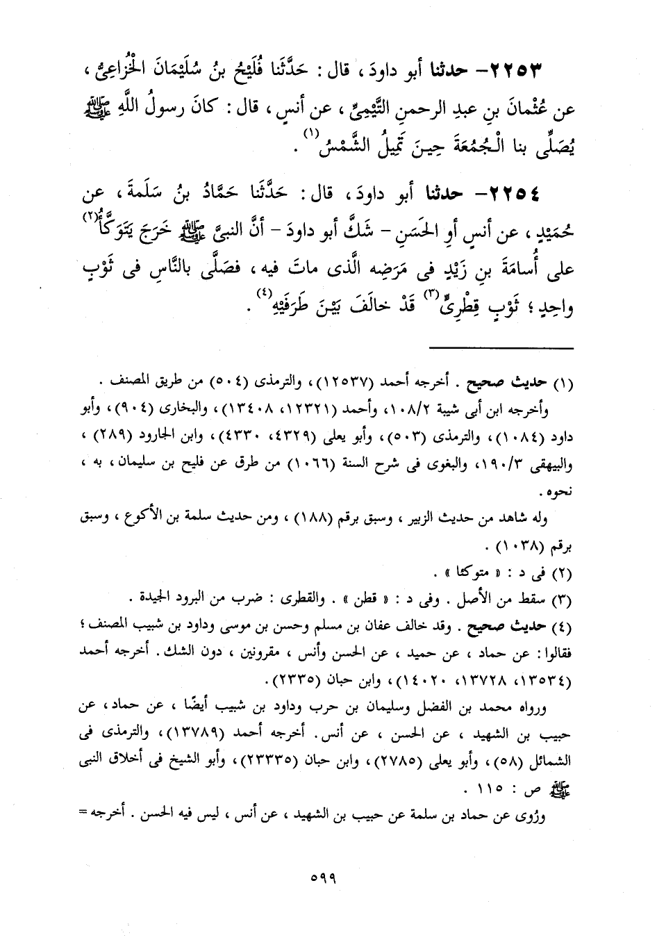 2253 - حَدَّثَنَا أَبُو دَاوُدَ قَالَ: حَدَّثَنَا فُلَيْحُ بْنُ سُلَيْمَانَ الْخُزَاعِيُّ، عَنْ عُثْمَانَ بْنِ عَبْدِ الرَّحْمَنِ التَّيْمِيِّ، عَنْ أَنَسٍ، قَالَ: «كَانَ رَسُولُ اللَّهِ صَلَّى اللهُ عَلَيْهِ وَسَلَّمَ §يُصَلِّي بِنَا الْجُمُعَةَ حِينَ تَمِيلُ الشَّمْسُ»