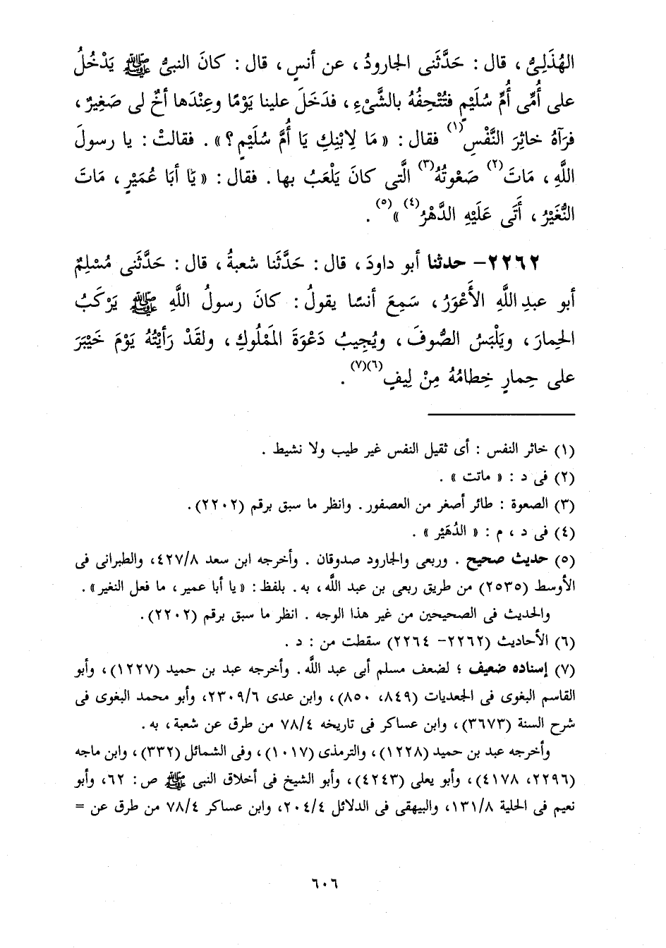 2262 - حَدَّثَنَا أَبُو دَاوُدَ قَالَ: حَدَّثَنَا شُعْبَةُ، قَالَ: حَدَّثَنِي مُسْلِمٌ أَبُو عَبْدِ اللَّهِ الْأَعْوَرُ، سَمِعَ أَنَسًا، يَقُولُ: «كَانَ رَسُولُ اللَّهِ صَلَّى اللهُ عَلَيْهِ وَسَلَّمَ §يَرْكَبُ الْحِمَارَ، وَيَلْبَسُ الصُّوفَ، وَيُجِيبُ دَعْوَةَ الْمَمْلُوكِ، وَلَقَدْ رَأَيْتُهُ يَوْمَ خَيْبَرَ عَلَى حِمَارٍ خِطَامُهُ مِنْ لِيفٍ»