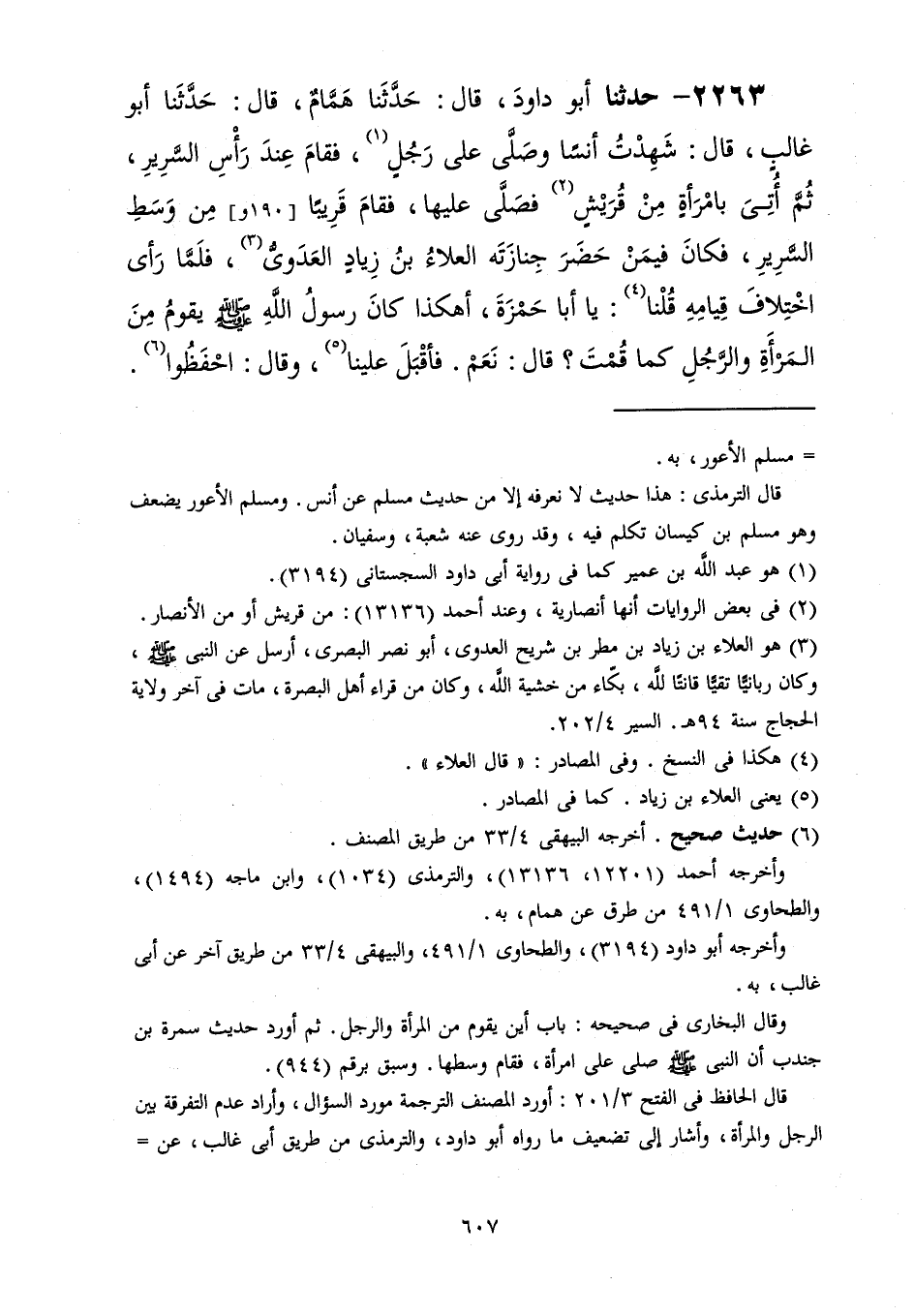 2263 - حَدَّثَنَا أَبُو دَاوُدَ قَالَ: حَدَّثَنَا هَمَّامٌ، قَالَ: حَدَّثَنَا أَبُو غَالِبٍ، قَالَ: شَهِدْتُ أَنَسًا §وَصَلَّى عَلَى رَجُلٍ، فَقَامَ عِنْدَ رَأْسِ السَّرِيرِ، ثُمَّ أُتِيَ بِامْرَأَةٍ مِنْ قُرَيْشٍ، فَصَلَّى عَلَيْهَا، فَقَامَ قَرِيبًا مِنْ وَسَطِ السَّرِيرِ، فَكَانَ فِيمَنْ حَضَرَ جِنَازَتَهُ الْعَلَاءُ بْنُ زِيَادٍ الْعَدَوِيُّ، فَلَمَّا رَأَى اخْتِلَافَ قِيَامِهِ قُلْنَا: يَا أَبَا حَمْزَةَ، أَهَكَذَا كَانَ رَسُولُ اللَّهِ صَلَّى اللهُ عَلَيْهِ وَسَلَّمَ يَقُومُ مِنَ الْمَرْأَةِ وَالرَّجُلِ كَمَا قُمْتَ؟ قَالَ: «نَعَمْ» فَأَقْبَلَ عَلَيْنَا وَقَالَ: «احْفَظُوا»