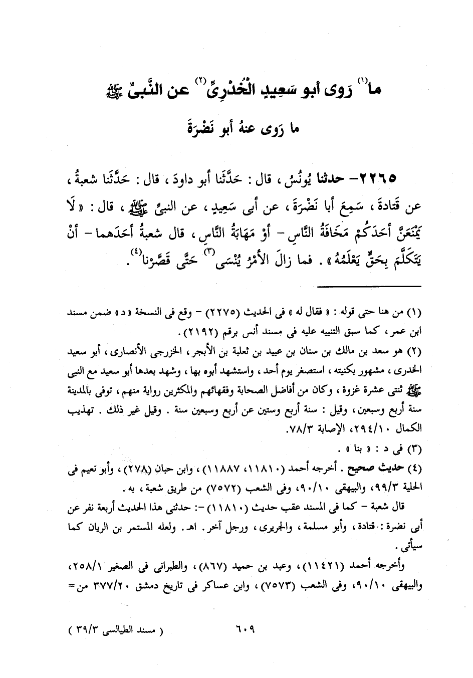 2265 - حَدَّثَنَا يُونُسُ قَالَ: حَدَّثَنَا أَبُو دَاوُدَ قَالَ: حَدَّثَنَا شُعْبَةُ، عَنْ قَتَادَةَ، سَمِعَ أَبَا نَضْرَةَ، عَنْ أَبِي سَعِيدٍ عَنِ النَّبِيِّ صَلَّى اللهُ عَلَيْهِ وَسَلَّمَ قَالَ: «§لَا يَمْنَعَنَّ أَحَدَكُمْ مَخَافَةُ النَّاسِ» أَوْ «مَهَابَةُ النَّاسِ» قَالَ شُعْبَةُ أَحَدَهُمَا «أَنْ يَتَكَلَّمَ بِحَقٍّ يَعْلَمُهُ» ، فَمَا زَالَ الْأَمْرُ يُنْسَى حَتَّى قَصَّرْنَا