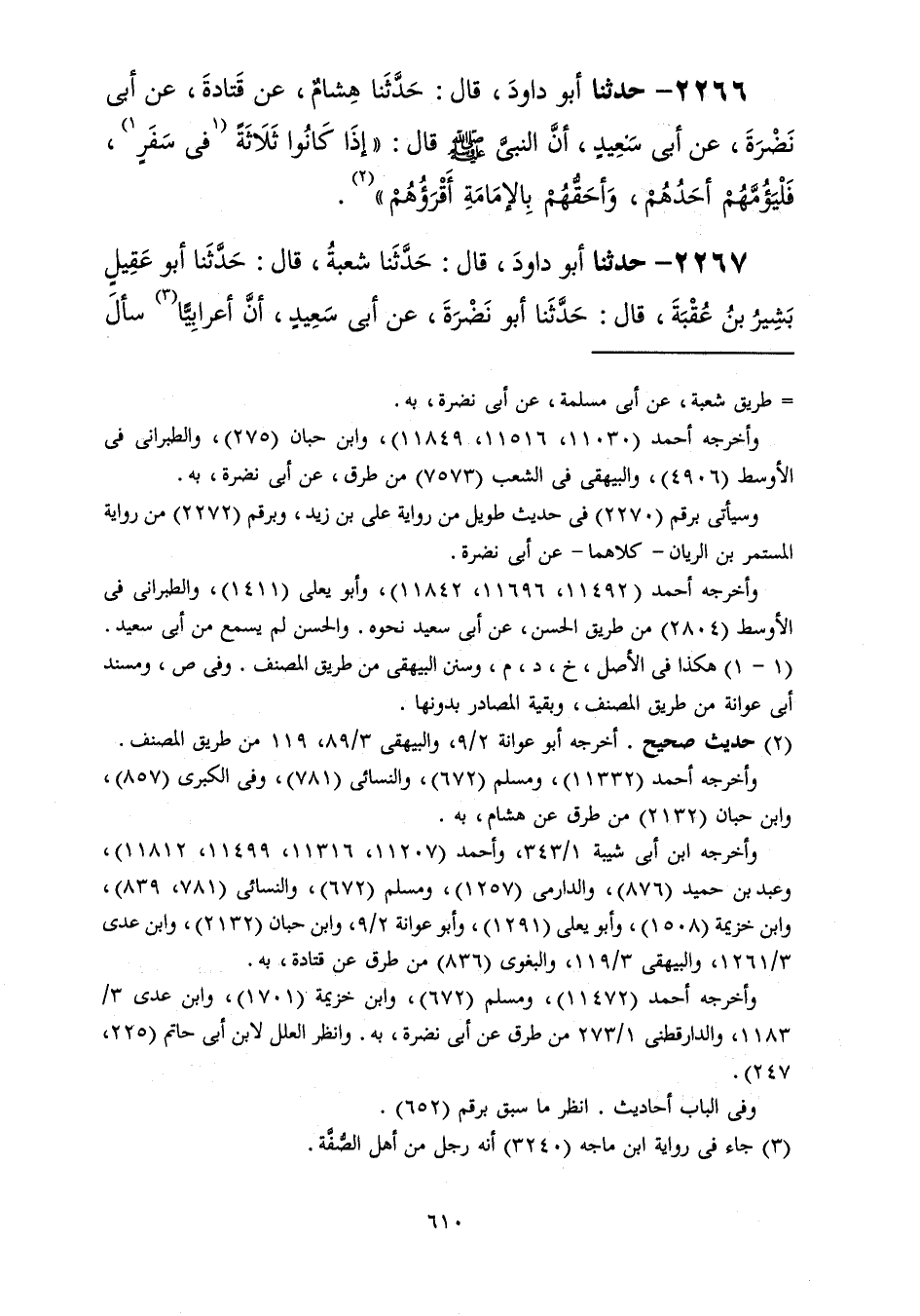 2266 - حَدَّثَنَا أَبُو دَاوُدَ قَالَ: حَدَّثَنَا هِشَامٌ، عَنْ قَتَادَةَ، عَنْ أَبِي نَضْرَةَ، عَنْ أَبِي سَعِيدٍ، أَنَّ النَّبِيَّ صَلَّى اللهُ عَلَيْهِ وَسَلَّمَ قَالَ: «إِذَا كَانُوا ثَلَاثَةً فِي سَفَرٍ، §فَلْيَؤُمَّهُمْ أَحَدُهُمْ، وَأَحَقُّهُمْ بِالْإِمَامَةِ أَقْرَؤُهُمْ»