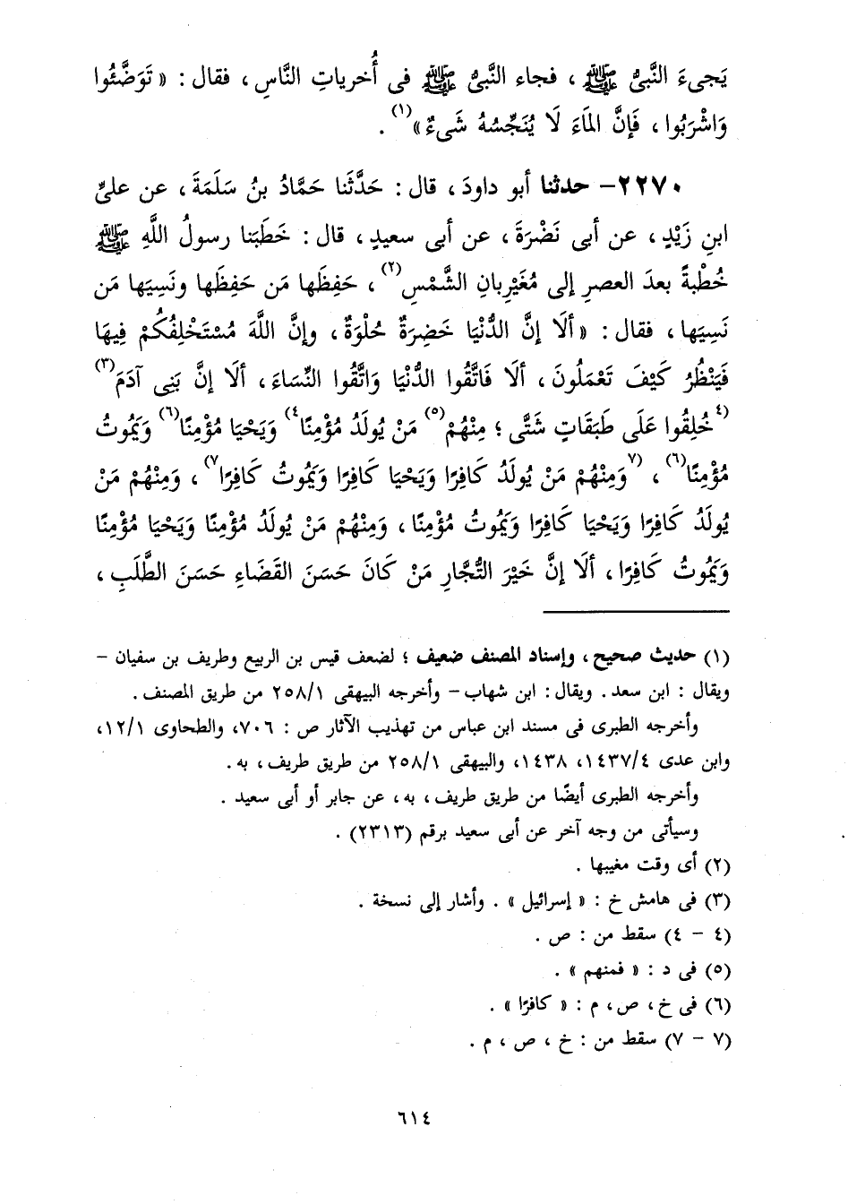 2270 - حَدَّثَنَا أَبُو دَاوُدَ قَالَ: حَدَّثَنَا حَمَّادُ بْنُ سَلَمَةَ، عَنْ عَلِيِّ بْنِ زَيْدٍ، عَنْ أَبِي نَضْرَةَ، عَنْ أَبِي سَعِيدٍ، قَالَ: خَطَبَنَا رَسُولُ اللَّهِ صَلَّى اللهُ عَلَيْهِ وَسَلَّمَ خُطْبَةً بَعْدَ الْعَصْرِ إِلَى مُغَيْرِبَانِ الشَّمْسِ، حَفِظَهَا مَنْ حَفِظَهَا، وَنَسِيَهَا مَنْ نَسِيَهَا، فَقَالَ: «أَلَا إِنَّ §الدُّنْيَا خَضِرَةٌ حُلْوَةٌ، وَإِنَّ اللَّهَ مُسْتَخْلِفُكُمْ فِيهَا فَيَنْظُرُ كَيْفَ تَعْمَلُونَ، أَلَا فَاتَّقُوا الدُّنْيَا، وَاتَّقُوا النِّسَاءَ، أَلَا إِنَّ بَنِي آدَمَ خُلِقُوا عَلَى طَبَقَاتٍ شَتَّى، مِنْهُمْ مَنْ يُولَدُ مُؤْمِنًا، وَيَحْيَا مُؤْمِنًا، وَيَمُوتُ مُؤْمِنًا، وَمِنْهُمْ مَنْ يُولَدُ كَافِرًا، وَيَحْيَا كَافِرًا، وَيَمُوتُ كَافِرًا، وَمِنْهُمْ مَنْ يُولَدُ كَافِرًا، وَيَحْيَا كَافِرًا، وَيَمُوتُ مُؤْمِنًا، وَمِنْهُمْ مَنْ يُولَدُ مُؤْمِنًا، وَيَحْيَا مُؤْمِنًا، وَيَمُوتُ كَافِرًا، أَلَا إِنَّ خَيْرَ التُّجَّارِ مَنْ كَانَ حَسَنَ الْقَضَاءِ حَسَنَ الطَّلَبِ -[615]-، أَلَا وَشَرُّ التُّجَّارِ مَنْ كَانَ سَيِّئَ الْقَضَاءِ سَيِّئَ الطَّلَبِ، فَإِذَا كَانَ حَسَنَ الْقَضَاءِ سَيِّئَ الطَّلَبِ، أَوْ حَسَنَ الطَّلَبِ سَيِّئَ الْقَضَاءِ فَإِنَّهَا بِهَا، أَلَا وَإِنَّ شَرَّ الرِّجَالِ مَنْ كَانَ سَرِيعَ الْغَضَبِ بَطِيءَ الْفَيْءِ، أَلَا وَخَيْرُ الرِّجَالِ مَنْ كَانَ بَطِيءَ الْغَضَبِ سَرِيعَ الْفَيْءِ، فَإِذَا كَانَ سَرِيعَ الْغَضَبِ سَرِيعَ الْفَيْءِ فَإِنَّهَا بِهَا، وَإِذَا كَانَ بَطِيءَ الْغَضَبِ بَطِيءَ الْفَيْءِ فَإِنَّهَا بِهَا، أَلَّا إِنَّ الْغَضَبَ جَمْرَةٌ تَوَقَّدُ فِي جَوْفِ ابْنِ آدَمَ، أَلَمْ تَرَ إِلَى حُمْرَةِ عَيْنَيْهِ، وَانْتِفَاخِ أَوْدَاجِهِ، فَإِذَا كَانَ ذَلِكَ فَالْأَرْضَ الْأَرْضَ، أَلَا إِنَّ لِكُلَّ غَادِرٍ لِوَاءً بِقَدْرِ غَدْرَتِهِ» قَالَ الْحَسَنُ: يُنْصَبُ عِنْدَ اسْتِهِ، ثُمَّ رَجَعَ إِلَى حَدِيثِ أَبِي سَعِيدٍ ثُمَّ قَالَ: «أَلَا وَلَا غَادِرَ أَعْظَمُ غَدْرًا مِنْ أَمِيرِ عَامَّةٍ، أَلَا لَا يَمْنَعَنَّ رَجُلًا مَهَابَةُ النَّاسِ أَنْ يَتَكَلَّمَ بِحَقٍّ إِذَا عَلِمَهُ، أَلَا إِنَّهُ لَمْ يَبْقَ مِنَ الدُّنْيَا فِيمَا مَضَى مِنْهَا إِلَّا كَمَا بَقِّيَ مِنْ يَوْمِكُمْ هَذَا فِيمَا مَضَى مِنْهُ»