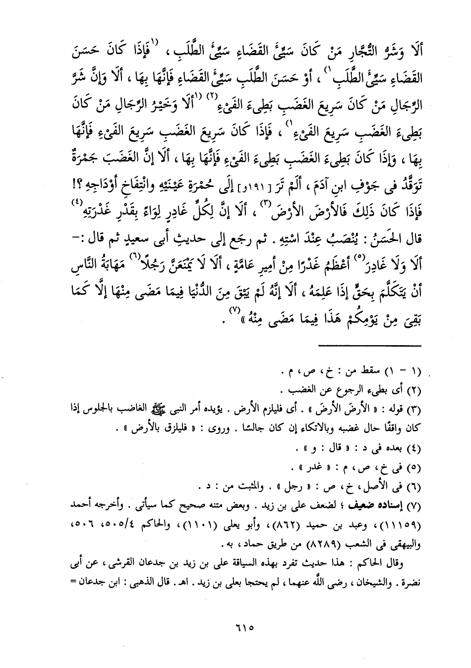 أَلاَ وَإِنَّ شَرَّ الرِّجَالِ مَنْ كَانَ سَرِيعَ الْغَضَبِ بَطِيءَ الْفَيْءِ، أَلاَ وَخَيْرُ الرِّجَالِ مَنْ كَانَ بَطِيءَ الْغَضَبِ سَرِيعَ الْفَيْءِ، فَإِذَا كَانَ سَرِيعَ الْغَضَبِ سَرِيعَ الْفَيْءِ فَإِنَّهَا بِهَا، وَإِذَا كَانَ بَطِيءَ الْغَضَبِ بَطِيءَ الْفَيْءِ فَإِنَّهَا بِهَا، أَلاَّ إِنَّ الْغَضَبَ جَمْرَةٌ تَوَقَّدُ فِي جَوْفِ ابْنِ آدَمَ، أَلَمْ تَرَ إِلَى حُمْرَةِ عَيْنَيْهِ، وَانْتِفَاخِ أَوْدَاجِهِ، فَإِذَا كَانَ ذَلِكَ فَالأَرْضَ الأَرْضَ، أَلاَ إِنَّ لِكُلَّ غَادِرٍ لِوَاءً بِقَدْرِ غَدْرَتِهِ . قَالَ الْحَسَنُ: (1) يُنْصَبُ عِنْدَ اسْتِهِ، ثُمَّ رَجَعَ إِلَى حَدِيثِ أَبِي سَعِيدٍ، ثُمَّ قَالَ: أَلاَ وَلاَ غَادِرَ أَعْظَمُ غَدْرًا مِنْ أَمِيرِ عَامَّةٍ، أَلاَ لاَ يَمْنَعَنَّ رَجُلاً مَهَابَةُ النَّاسِ أَنْ يَتَكَلَّمَ بِحَقٍّ إِذَا عَلِمَهُ، أَلاَ إِنَّهُ لَمْ يَبْقَ مِنَ الدُّنْيَا فِيمَا مَضَى مِنْهَا إِلاَّ كَمَا بَقِيَ مِنْ يَوْمِكُمْ هَذَا، فِيمَا مَضَى مِنْهُ.