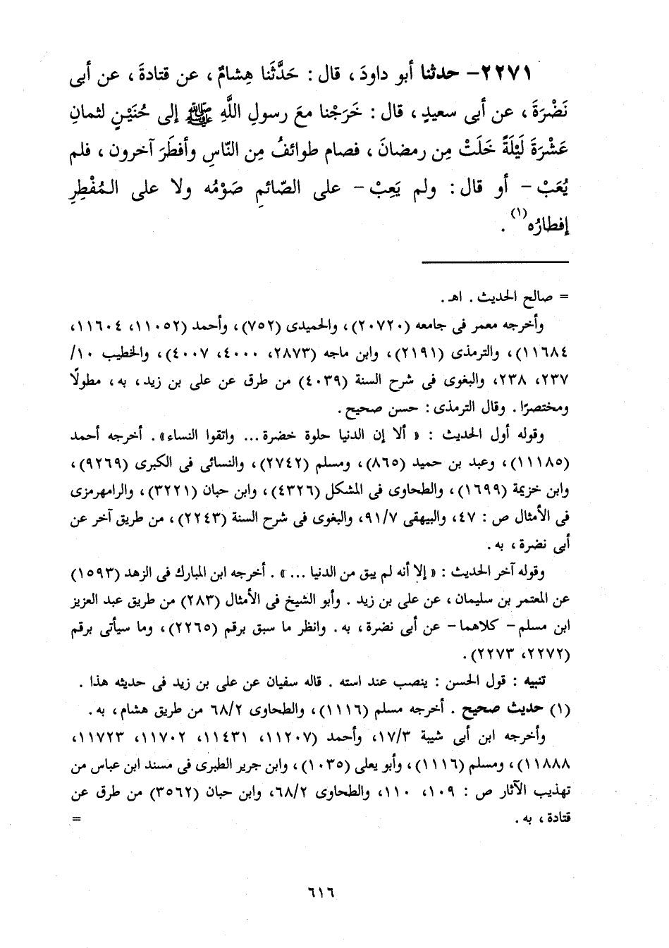 2271 - حَدَّثَنَا أَبُو دَاوُدَ قَالَ: حَدَّثَنَا هِشَامٌ، عَنْ قَتَادَةَ، عَنْ أَبِي نَضْرَةَ، عَنْ أَبِي سَعِيدٍ، قَالَ: «خَرَجْنَا مَعَ رَسُولِ اللَّهِ صَلَّى اللهُ عَلَيْهِ وَسَلَّمَ إِلَى حُنَيْنٍ لِثَمَانِ عَشْرَةَ لَيْلَةً خَلَتْ مِنْ رَمَضَانَ، §فَصَامَ طَوَائِفُ مِنَ النَّاسِ، وَأَفْطَرَ آخَرُونَ، فَلَمْ يُعَبْ» أَوْ قَالَ: «وَلَمْ يَعِبْ عَلَى الصَّائِمِ صَوْمَهُ وَلَا عَلَى الْمُفْطِرِ إِفْطَارَهُ»