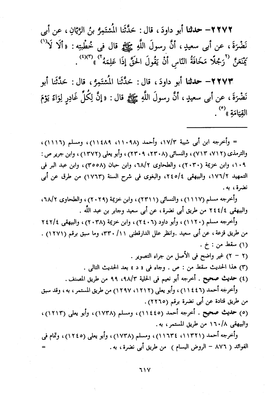 2272 - حَدَّثَنَا أَبُو دَاوُدَ قَالَ: حَدَّثَنَا الْمُسْتَمِرُّ بْنُ الرَّيَّانِ، عَنْ أَبِي نَضْرَةَ، عَنْ أَبِي سَعِيدٍ، أَنَّ رَسُولَ اللَّهِ صَلَّى اللهُ عَلَيْهِ وَسَلَّمَ قَالَ فِي خُطْبَتِهِ: «أَلَا §لَا يَمْنَعَنَّ رَجُلًا مَخَافَةُ النَّاسِ أَنْ يَقُولَ الْحَقَّ إِذَا عَلِمَهُ»