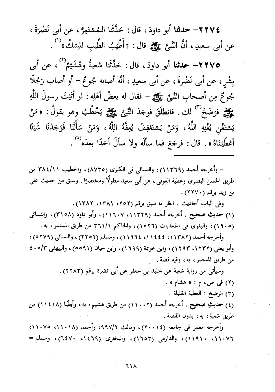 2274 - حَدَّثَنَا أَبُو دَاوُدَ قَالَ: حَدَّثَنَا الْمُسْتَمِرُّ، عَنْ أَبِي نَضْرَةَ، عَنْ أَبِي سَعِيدٍ، أَنَّ النَّبِيَّ صَلَّى اللهُ عَلَيْهِ وَسَلَّمَ قَالَ: «§أَطْيَبُ الطِّيبِ الْمِسْكُ»