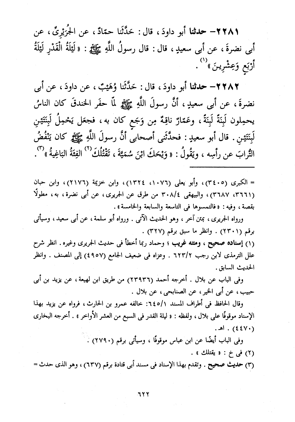 2281 - حَدَّثَنَا أَبُو دَاوُدَ قَالَ: حَدَّثَنَا حَمَّادٌ، عَنِ الْجُرَيْرِيِّ، عَنْ أَبِي نَضْرَةَ، عَنْ أَبِي سَعِيدٍ، قَالَ: قَالَ رَسُولُ اللَّهِ صَلَّى اللهُ عَلَيْهِ وَسَلَّمَ: «§لَيْلَةُ الْقَدْرِ لَيْلَةُ أَرْبَعٍ وَعِشْرِينَ»