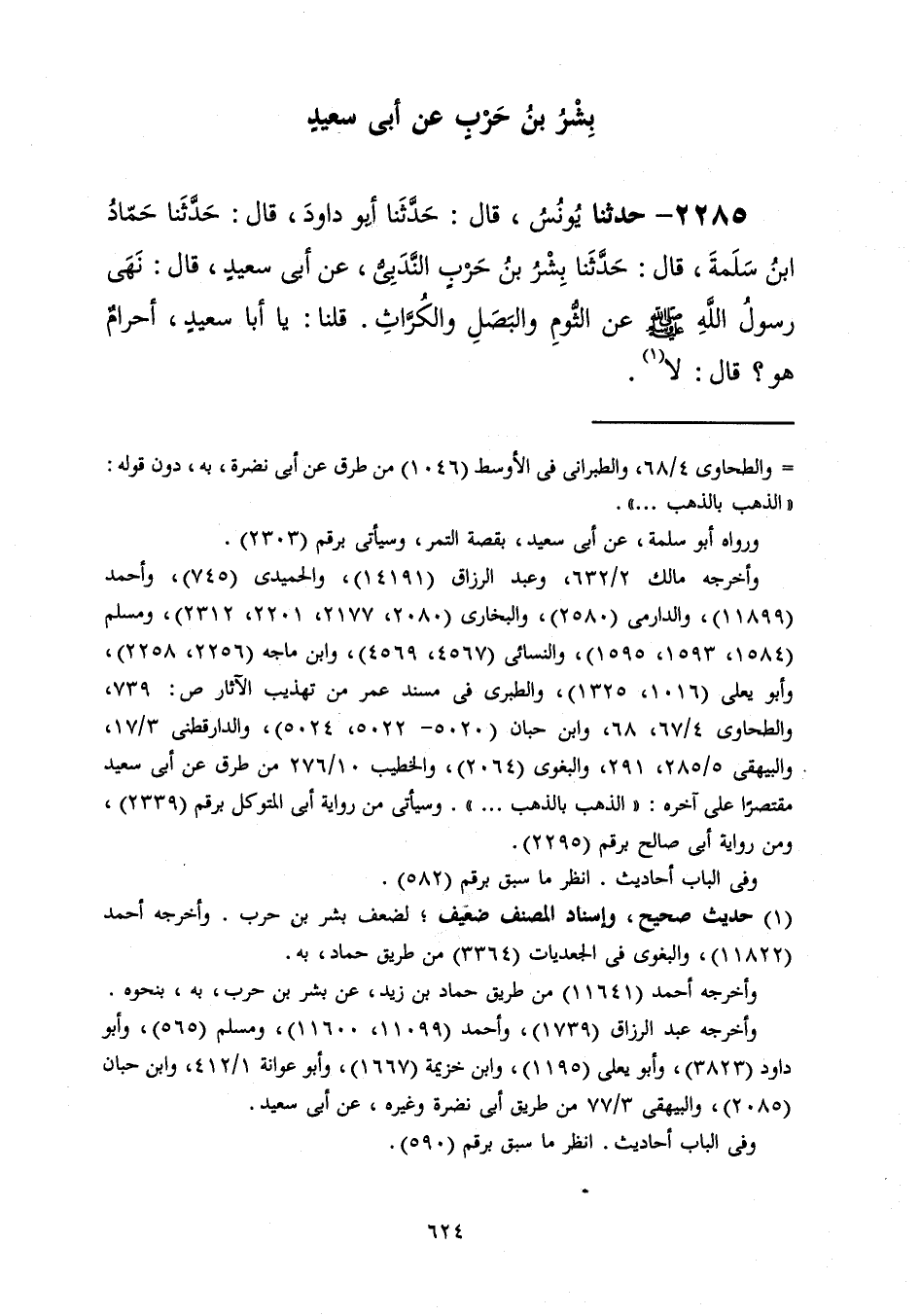 2285 - حَدَّثَنَا يُونُسُ قَالَ: حَدَّثَنَا أَبُو دَاوُدَ قَالَ: حَدَّثَنَا حَمَّادُ بْنُ سَلَمَةَ، قَالَ: حَدَّثَنَا بِشْرُ بْنُ حَرْبٍ النَّدَبِيُّ، عَنْ أَبِي سَعِيدٍ، قَالَ: «§نَهَى رَسُولُ اللَّهِ صَلَّى اللهُ عَلَيْهِ وَسَلَّمَ عَنِ الثُّومِ وَالْبَصَلِ وَالْكُرَّاثِ» قُلْنَا: يَا أَبَا سَعِيدٍ، أَحَرَامٌ هُوَ؟ قَالَ: لَا