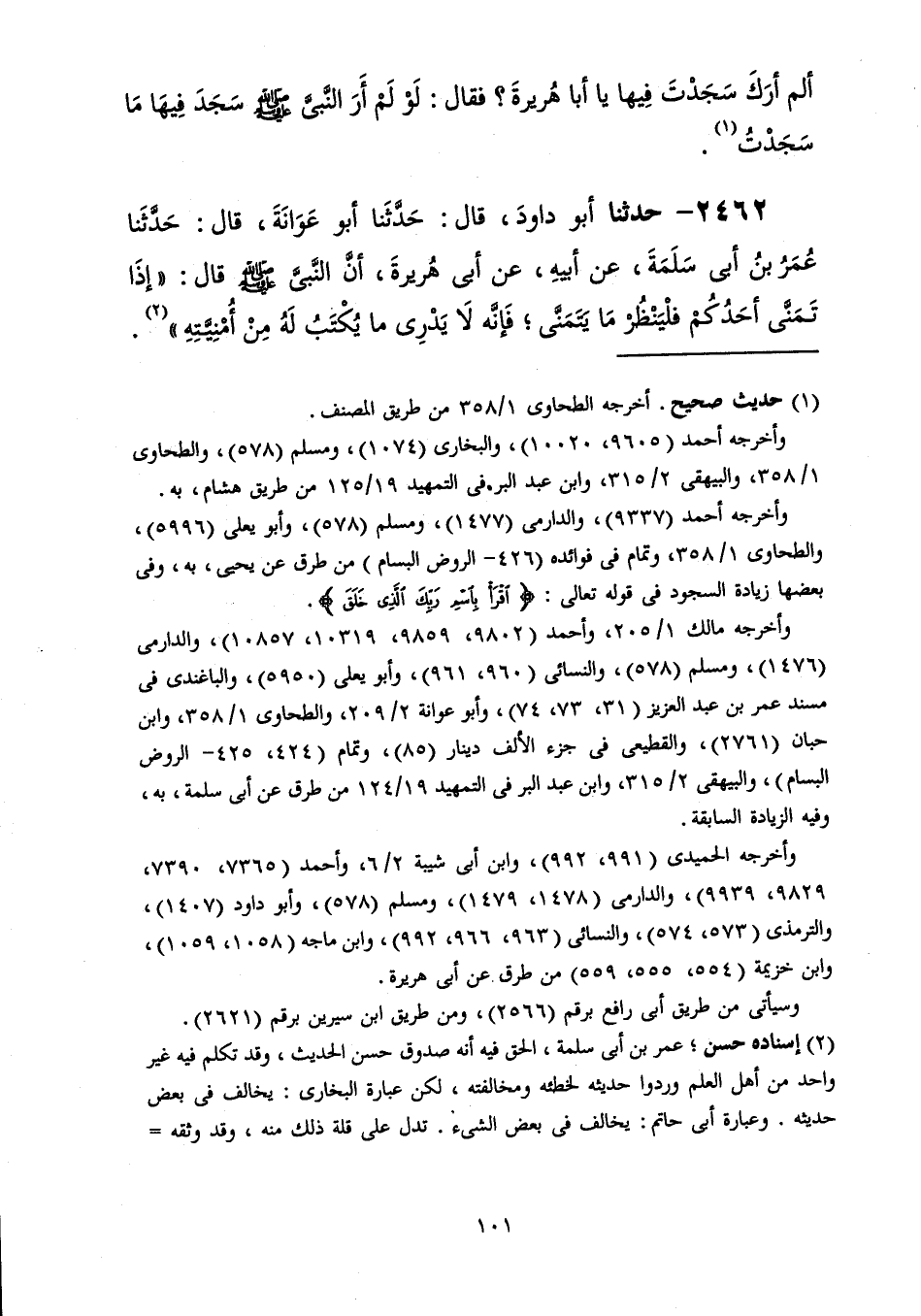 2462 - حَدَّثَنَا أَبُو دَاوُدَ قَالَ: حَدَّثَنَا أَبُو عَوَانَةَ، قَالَ: حَدَّثَنَا عُمَرُ بْنُ أَبِي سَلَمَةَ، عَنْ أَبِيهِ، عَنْ أَبِي هُرَيْرَةَ، أَنَّ النَّبِيَّ صَلَّى اللهُ عَلَيْهِ وَسَلَّمَ قَالَ: «§إِذَا تَمَنَّى أَحَدُكُمُ الْمَوْتَ فَلْيَنْظُرْ مَا يَتَمَنَّى، فَإِنَّهُ لَا يَدْرِي مَا يُكْتَبُ لَهُ مِنْ أُمْنِيَّتِهِ»