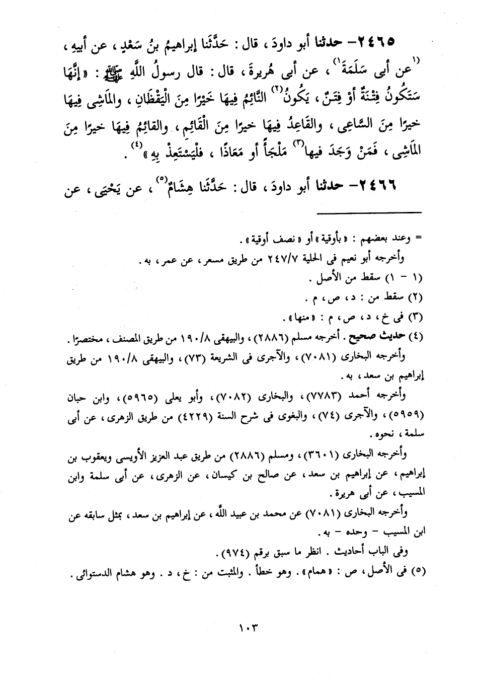 2465 - حَدَّثَنَا أَبُو دَاوُدَ قَالَ: حَدَّثَنَا إِبْرَاهِيمُ بْنُ سَعْدٍ، عَنْ أَبِيهِ، عَنْ أَبِي سَلَمَةَ، عَنْ أَبِي هُرَيْرَةَ، قَالَ: قَالَ رَسُولُ اللَّهِ صَلَّى اللهُ عَلَيْهِ وَسَلَّمَ: «إِنَّهَا §سَتَكُونُ فِتْنَةٌ، أَوْ فِتَنٌ، يَكُونُ النَّائِمُ فِيهَا خَيْرًا مِنَ الْيَقْظَانِ، وَالْمَاشِي فِيهَا خَيْرًا مِنَ السَّاعِي، وَالْقَاعِدُ فِيهَا خَيْرًا مِنَ الْقَائِمِ، وَالْقَائِمُ فِيهَا خَيْرًا مِنَ الْمَاشِي، فَمَنْ وَجَدَ مِنْهَا مَلْجَأً أَوْ مَعَاذًا فَلْيَسْتَعِذْ بِهِ»