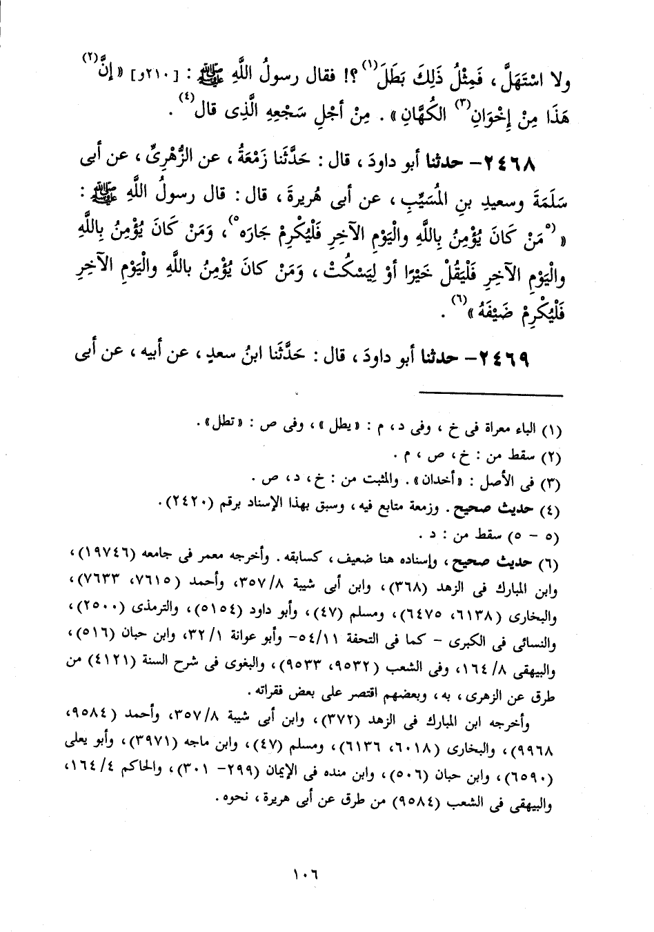 2468 - حَدَّثَنَا أَبُو دَاوُدَ قَالَ: حَدَّثَنَا زَمْعَةُ، عَنِ الزُّهْرِيِّ، عَنْ أَبِي سَلَمَةَ، وَسَعِيدِ بْنِ الْمُسَيِّبِ، عَنْ أَبِي هُرَيْرَةَ، قَالَ: قَالَ رَسُولُ اللَّهِ صَلَّى اللهُ عَلَيْهِ وَسَلَّمَ: «§مَنْ كَانَ يُؤْمِنُ بِاللَّهِ وَالْيَوْمِ الْآخِرِ فَلْيُكْرِمْ جَارَهُ، وَمَنْ كَانَ يُؤْمِنُ بِاللَّهِ وَالْيَوْمِ الْآخِرِ فَلْيَقُلْ خَيْرًا أَوْ لِيَسْكُتْ، وَمَنْ كَانَ يُؤْمِنُ بِاللَّهِ وَالْيَوْمِ الْآخِرِ فَلْيُكْرِمْ ضَيْفَهُ»