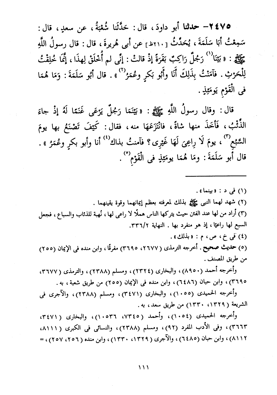 2475 - حَدَّثَنَا أَبُو دَاوُدَ قَالَ: حَدَّثَنَا شُعْبَةُ، عَنْ سَعْدٍ، قَالَ: سَمِعْتُ أَبَا سَلَمَةَ، يُحَدِّثُ عَنْ أَبِي هُرَيْرَةَ، قَالَ: قَالَ رَسُولُ اللَّهِ صَلَّى اللهُ عَلَيْهِ وَسَلَّمَ: " §بَيْنَا رَجُلٌ رَاكِبٌ بَقَرَةً إِذْ قَالَتْ: إِنِّي لَمْ أُخْلَقْ لِهَذَا، إِنَّمَا خُلِقْتُ لِلْحَرْثِ، فَآمَنْتُ بِذَلِكَ أَنَا وَأَبُو بَكْرٍ وَعُمَرُ " قَالَ أَبُو سَلَمَةَ: وَمَا هُمَا فِي الْقَوْمِ يَوْمَئِذٍ