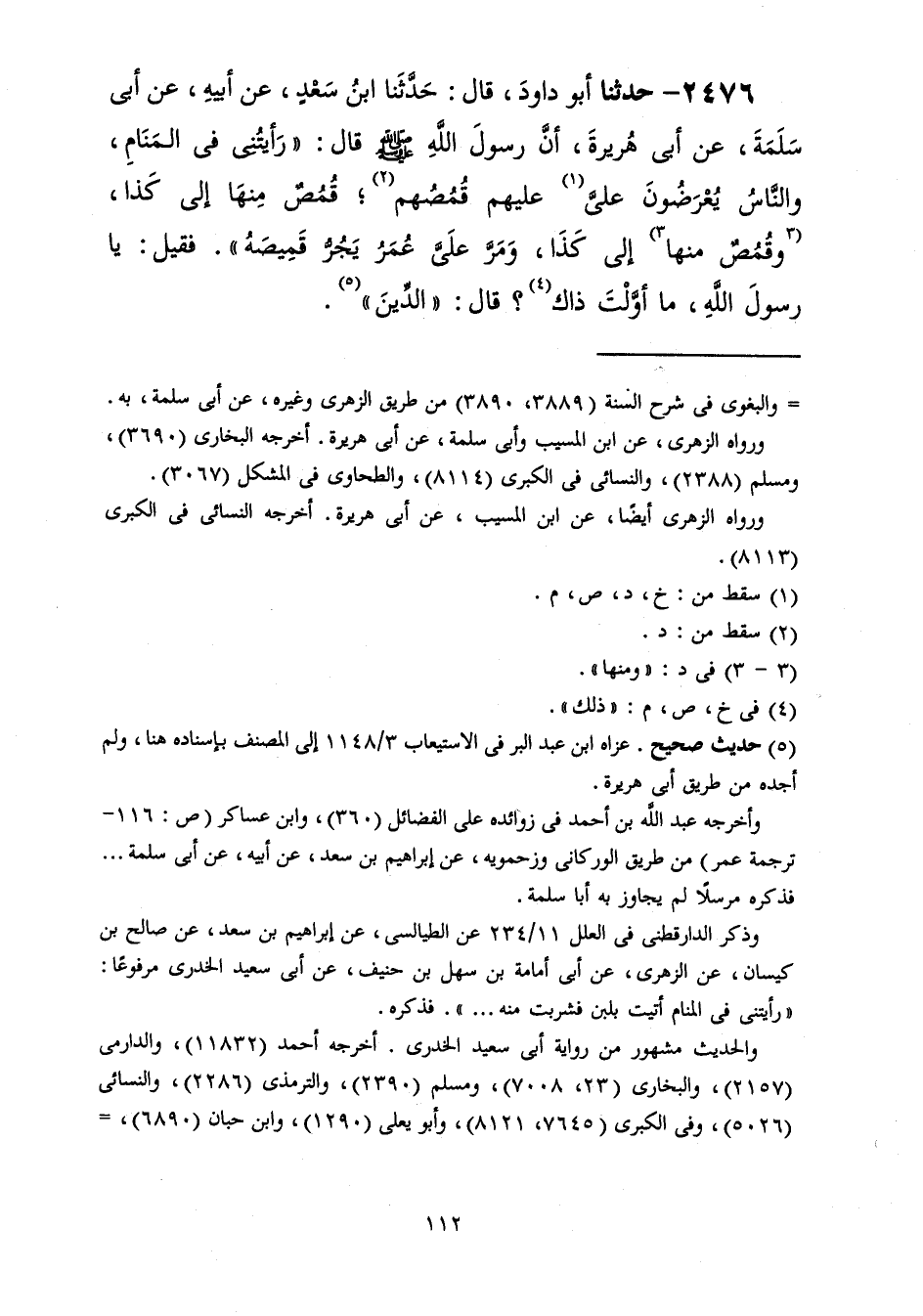 2476 - حَدَّثَنَا أَبُو دَاوُدَ قَالَ: حَدَّثَنَا ابْنُ سَعْدٍ، عَنْ أَبِيهِ، عَنْ أَبِي سَلَمَةَ، عَنْ أَبِي هُرَيْرَةَ، أَنَّ رَسُولَ اللَّهِ صَلَّى اللهُ عَلَيْهِ وَسَلَّمَ قَالَ: «§رَأَيْتُنِي فِي الْمَنَامِ وَالنَّاسُ يُعْرَضُونَ عَلَيَّ عَلَيْهِمْ قُمُصُهُمْ، قُمُصٌ مِنْهَا إِلَى كَذَا، وقمصٌ مِنْهَا إِلَى كَذَا، وَمَرَّ عَلَيَّ عُمَرُ يَجُرُّ قَمِيصَهُ» فَقِيلَ: يَا رَسُولَ اللَّهِ، مَا أَوَّلْتَ ذَلِكَ؟، قَالَ: «الدِّينَ»