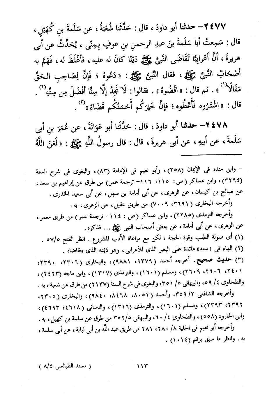 2477 - حَدَّثَنَا أَبُو دَاوُدَ قَالَ: حَدَّثَنَا شُعْبَةُ، عَنْ سَلَمَةَ بْنِ كُهَيْلٍ، قَالَ: سَمِعْتُ أَبَا سَلَمَةَ بْنَ عَبْدِ الرَّحْمَنِ بْنِ عَوْفٍ، بِمِنًى يُحَدِّثُ عَنْ أَبِي هُرَيْرَةَ، أَنَّ أَعْرَابِيًّا، تَقَاضَى النَّبِيَّ صَلَّى اللهُ عَلَيْهِ وَسَلَّمَ دَيْنًا كَانَ لَهُ عَلَيْهِ فَأَغْلَظَ لَهُ، فَهَمَّ بِهِ أَصْحَابُ النَّبِيِّ صَلَّى اللهُ عَلَيْهِ وَسَلَّمَ، فَقَالَ النَّبِيُّ صَلَّى اللهُ عَلَيْهِ وَسَلَّمَ: «§دَعُوهُ، فَإِنَّ لِصَاحِبِ الْحَقِّ مَقَالًا» ثُمَّ قَالَ: «اقْضُوهُ» فَقَالُوا: لَا نَجِدُ إِلَّا سِنًّا أَفْضَلَ مِنْ سِنِّهِ، قَالَ: «اشْتَرُوهُ فَأَعْطُوهُ، فَإِنَّ خَيْرَكُمْ أَحْسَنُكُمْ قَضَاءً»