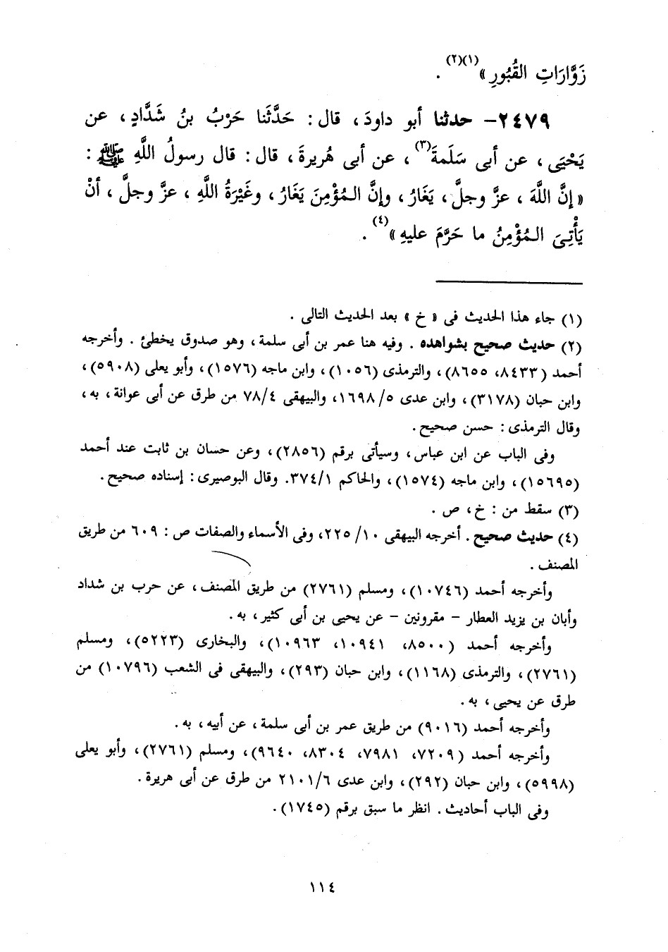 2479 - حَدَّثَنَا أَبُو دَاوُدَ قَالَ: حَدَّثَنَا حَرْبُ بْنُ شَدَّادٍ، عَنْ يَحْيَى، عَنْ أَبِي سَلَمَةَ، عَنْ أَبِي هُرَيْرَةَ، قَالَ: قَالَ رَسُولُ اللَّهِ صَلَّى اللهُ عَلَيْهِ وَسَلَّمَ: «إِنَّ §اللَّهَ عَزَّ وَجَلَّ يَغَارُ، وَإِنَّ الْمُؤْمِنَ يَغَارُ، وَغَيْرَةُ اللَّهِ عَزَّ وَجَلَّ أَنْ يَأْتِيَ الْمُؤْمِنُ مَا حَرَّمَ عَلَيْهِ»