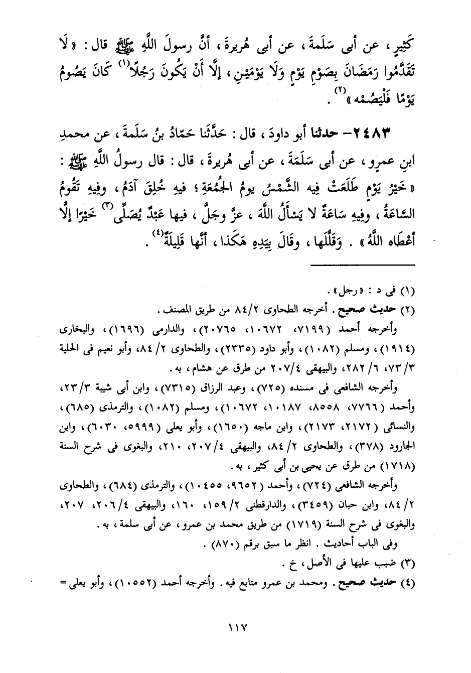 2483 - حَدَّثَنَا أَبُو دَاوُدَ قَالَ: حَدَّثَنَا حَمَّادُ بْنُ سَلَمَةَ، عَنْ مُحَمَّدِ بْنِ عَمْرٍو، عَنْ أَبِي سَلَمَةَ، عَنْ أَبِي هُرَيْرَةَ، قَالَ: قَالَ رَسُولُ اللَّهِ صَلَّى اللهُ عَلَيْهِ وَسَلَّمَ: «§خَيْرُ يَوْمٍ طَلَعَتْ فِيهِ الشَّمْسُ يَوْمُ الْجُمُعَةِ، فِيهِ خُلِقَ آدَمُ، وَفِيهِ تَقُومُ السَّاعَةُ، وَفِيهِ سَاعَةٌ لَا يَسْأَلُ اللَّهَ عَزَّ وَجَلَّ فِيهَا عَبْدٌ يُصَلِّي خَيْرًا إِلَّا أَعْطَاهُ اللَّهُ» وَقَلَّلَهَا، وَقَالَ بِيَدِهِ هَكَذَا أَنَّهَا قَلِيلَةٌ