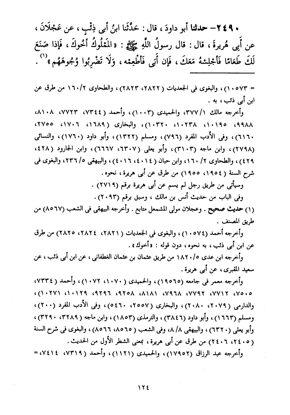 2490 - حَدَّثَنَا أَبُو دَاوُدَ قَالَ: حَدَّثَنَا ابْنُ أَبِي ذِئْبٍ، عَنْ عَجْلَانَ، عَنْ أَبِي هُرَيْرَةَ، قَالَ: قَالَ رَسُولُ اللَّهِ صَلَّى اللهُ عَلَيْهِ وَسَلَّمَ: «§الْمَمْلُوكُ أَخُوكَ، فَإِذَا صَنَعَ لَكَ طَعَامًا فَأَجْلِسْهُ مَعَكَ، فَإِنْ أَبَى فَأَطْعِمْهُ، وَلَا تَضْرِبُوا وُجُوهَهُمْ»