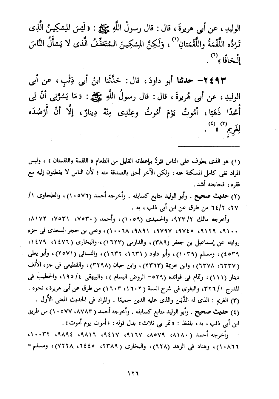 2493 - حَدَّثَنَا أَبُو دَاوُدَ قَالَ: حَدَّثَنَا ابْنُ أَبِي ذِئْبٍ، عَنْ أَبِي الْوَلِيدِ، عَنْ أَبِي هُرَيْرَةَ، قَالَ: قَالَ رَسُولُ اللَّهِ صَلَّى اللهُ عَلَيْهِ وَسَلَّمَ: «§مَا يَسُرُّنِي أَنَّ لِيَ أُحُدًا ذَهَبًا، أَمُوتُ يَوْمَ أَمُوتُ وَعِنْدِي مِنْهُ دِينَارٌ، إِلَّا أَنْ أَرْصُدَهُ لِغَرِيمٍ»