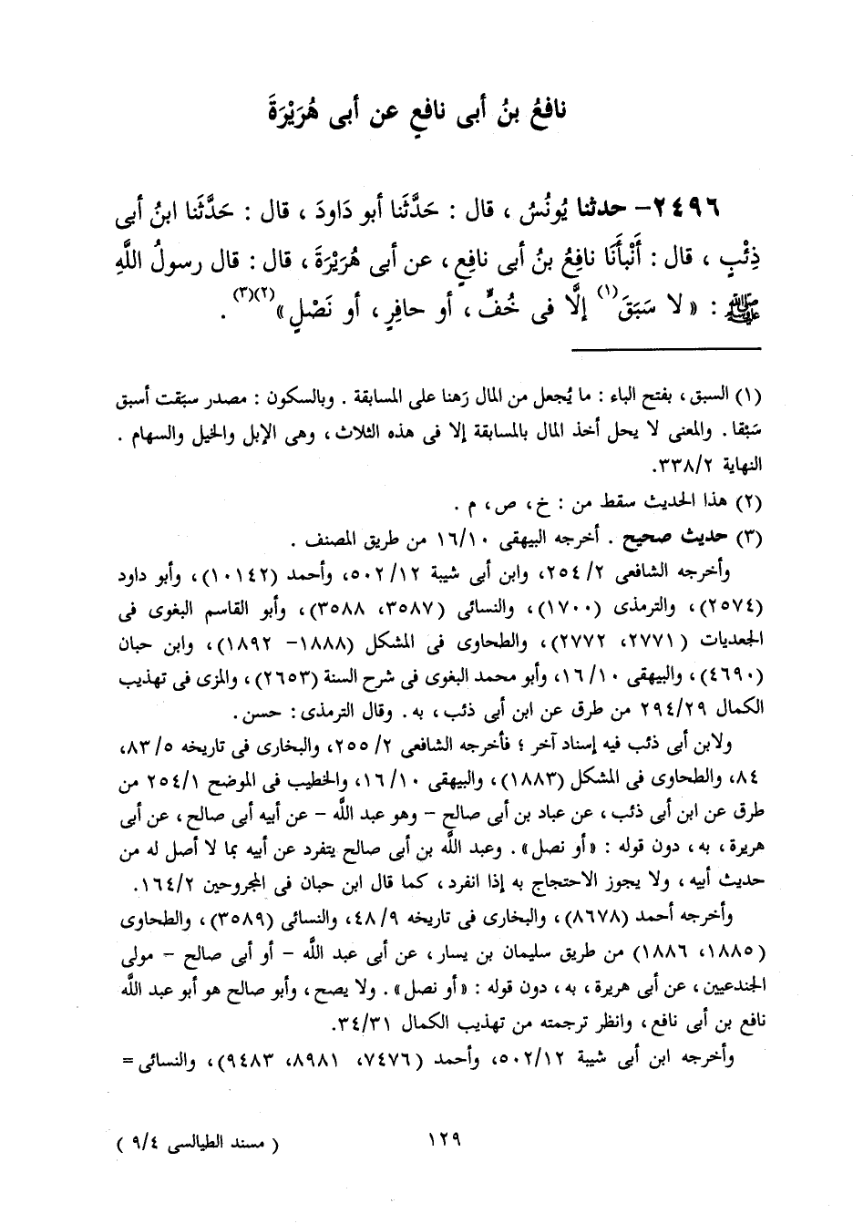 2496 - حَدَّثَنَا يُونُسُ قَالَ: حَدَّثَنَا أَبُو دَاوُدَ قَالَ: حَدَّثَنَا ابْنُ أَبِي ذِئْبٍ، قَالَ: أَنْبَأَنَا نَافِعُ بْنُ أَبِي نَافِعٍ، عَنْ أَبِي هُرَيْرَةَ، قَالَ: قَالَ رَسُولُ اللَّهِ صَلَّى اللهُ عَلَيْهِ وَسَلَّمَ: «§لَا سَبَقَ إِلَّا فِي خُفٍّ، أَوْ حَافِرٍ، أَوْ نَصْلٍ»