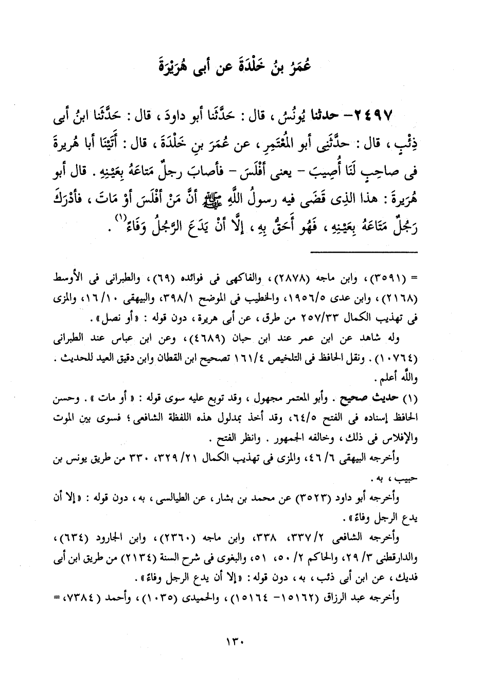 2497 - حَدَّثَنَا يُونُسُ قَالَ: حَدَّثَنَا أَبُو دَاوُدَ قَالَ: حَدَّثَنَا ابْنُ أَبِي ذِئْبٍ، قَالَ: حَدَّثَنِي أَبُو الْمُعْتَمِرِ عَنْ عُمَرَ بْنِ خَلْدَةَ، قَالَ: أَتَيْنَا أَبَا هُرَيْرَةَ فِي صَاحِبٍ لَنَا أُصِيبَ، يَعْنِي أَفْلَسَ، فَأَصَابَ رَجُلٌ مَتَاعَهُ بِعَيْنِهِ، قَالَ أَبُو هُرَيْرَةَ: هَذَا الَّذِي قَضَى فِيهِ رَسُولُ اللَّهِ صَلَّى اللهُ عَلَيْهِ وَسَلَّمَ أَنَّ «§مَنْ أَفْلَسَ أَوْ مَاتَ فَأَدْرَكَ رَجُلٌ مَتَاعَهُ بِعَيْنِهِ فَهُوَ أَحَقُّ بِهِ، إِلَّا أَنْ يَدَعَ الرَّجُلُ وَفَاءً»