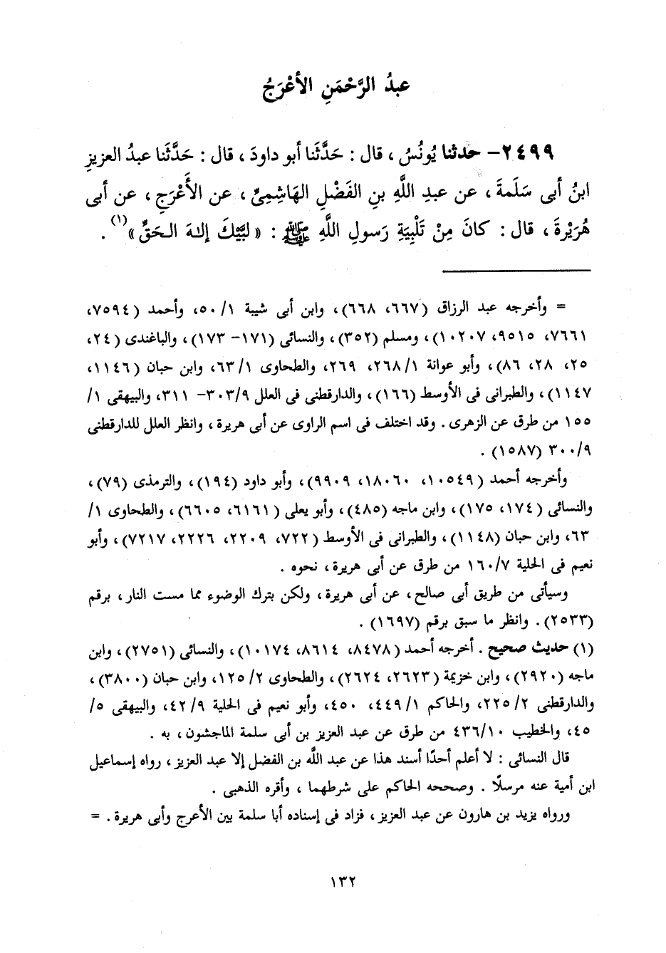 2499 - حَدَّثَنَا يُونُسُ قَالَ: حَدَّثَنَا أَبُو دَاوُدَ قَالَ: حَدَّثَنَا عَبْدُ الْعَزِيزِ بْنُ أَبِي سَلَمَةَ، عَنْ عَبْدِ اللَّهِ بْنِ الْفَضْلِ الْهَاشِمِيِّ، عَنِ الْأَعْرَجِ، عَنْ أَبِي هُرَيْرَةَ، قَالَ: كَانَ §مِنْ تَلْبِيَةِ رَسُولِ اللَّهِ صَلَّى اللهُ عَلَيْهِ وَسَلَّمَ: " لَبَّيْكَ إِلَهَ الْحَقِّ