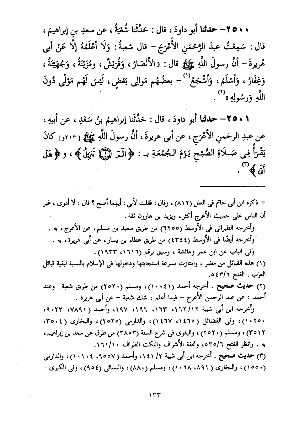 2501 - حَدَّثَنَا أَبُو دَاوُدَ قَالَ: حَدَّثَنَا إِبْرَاهِيمُ بْنُ سَعْدٍ، عَنْ أَبِيهِ، عَنْ عَبْدِ الرَّحْمَنِ الْأَعْرَجِ، عَنْ أَبِي هُرَيْرَةَ، أَنَّ رَسُولَ اللَّهِ صَلَّى اللهُ عَلَيْهِ وَسَلَّمَ «كَانَ §يَقْرَأُ فِي صَلَاةِ الصُّبْحِ يَوْمَ الْجُمُعَةِ بِـ الم تَنْزِيلُ وَهَلْ أَتَى»
