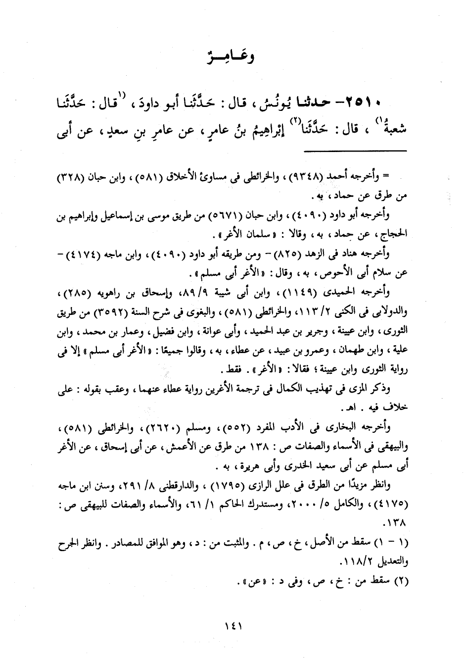 2510 - حَدَّثَنَا يُونُسُ قَالَ: حَدَّثَنَا أَبُو دَاوُدَ قَالَ: حَدَّثَنَا شُعْبَةُ قَالَ: حَدَّثَنَا إِبْرَاهِيمُ بْنُ عَامِرٍ، عَنْ عَامِرِ بْنِ سَعْدٍ، عَنْ أَبِي -[142]- هُرَيْرَةَ، قَالَ: مَرُّوا عَلَى رَسُولِ اللَّهِ صَلَّى اللهُ عَلَيْهِ وَسَلَّمَ بِجِنَازَةٍ فَأَثْنَوْا عَلَيْهَا خَيْرًا، فَقَالَ رَسُولُ اللَّهِ صَلَّى اللهُ عَلَيْهِ وَسَلَّمَ: «وَجَبَتْ» ثُمَّ مَرُّوا بِجِنَازَةٍ أُخْرَى فَأَثْنَوْا عَلَيْهَا شَرًّا، فَقَالَ رَسُولُ اللَّهِ صَلَّى اللهُ عَلَيْهِ وَسَلَّمَ: «وَجَبَتْ» وَقَالَ: «إِنَّ §بَعْضَكُمْ عَلَى بَعْضٍ شُهَدَاءُ»