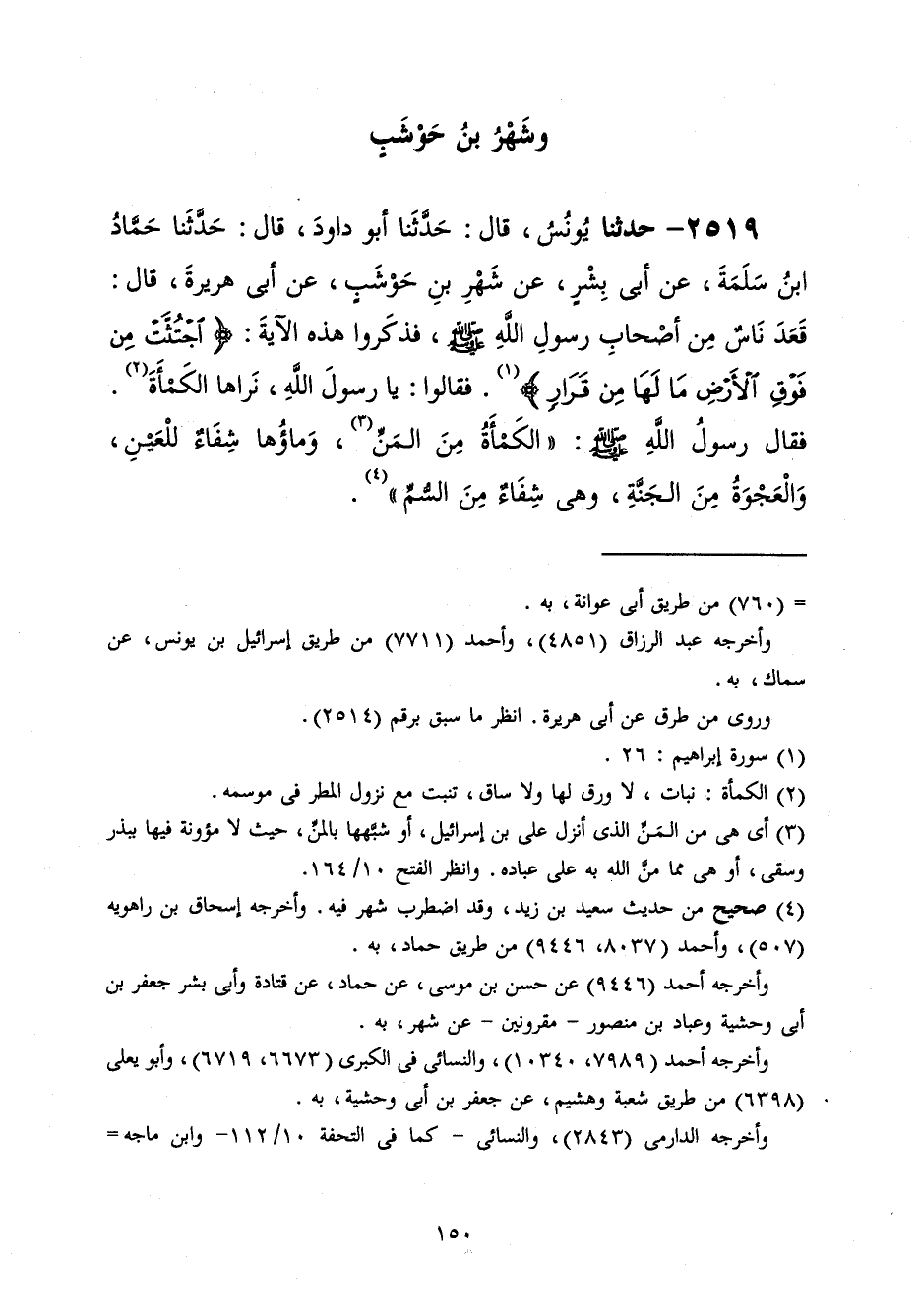 2519 - حَدَّثَنَا يُونُسُ قَالَ: حَدَّثَنَا أَبُو دَاوُدَ قَالَ: حَدَّثَنَا حَمَّادُ بْنُ سَلَمَةَ، عَنْ أَبِي بِشْرٍ، عَنْ شَهْرِ بْنِ حَوْشَبٍ، عَنْ أَبِي هُرَيْرَةَ، قَالَ: قَعَدَ نَاسٌ مِنْ أَصْحَابِ رَسُولِ اللَّهِ صَلَّى اللهُ عَلَيْهِ وَسَلَّمَ فَذَكَرُوا هَذِهِ الْآيَةَ: {اجْتُثَّتْ مِنْ فَوْقِ الْأَرْضِ مَا لَهَا مِنْ قَرَارٍ} [إبراهيم: 26] فَقَالُوا: يَا رَسُولَ اللَّهِ، نُرَاهَا الْكَمَأَةَ فَقَالَ رَسُولُ اللَّهِ صَلَّى اللهُ عَلَيْهِ وَسَلَّمَ: «§الْكَمَأَةُ مِنَ الْمَنِّ، وَمَاؤُهُ شِفَاءٌ لِلْعَيْنِ، وَالْعَجْوَةُ مِنَ الْجَنَّةِ، وَهِيَ شِفَاءٌ مِنَ السُّمِّ»