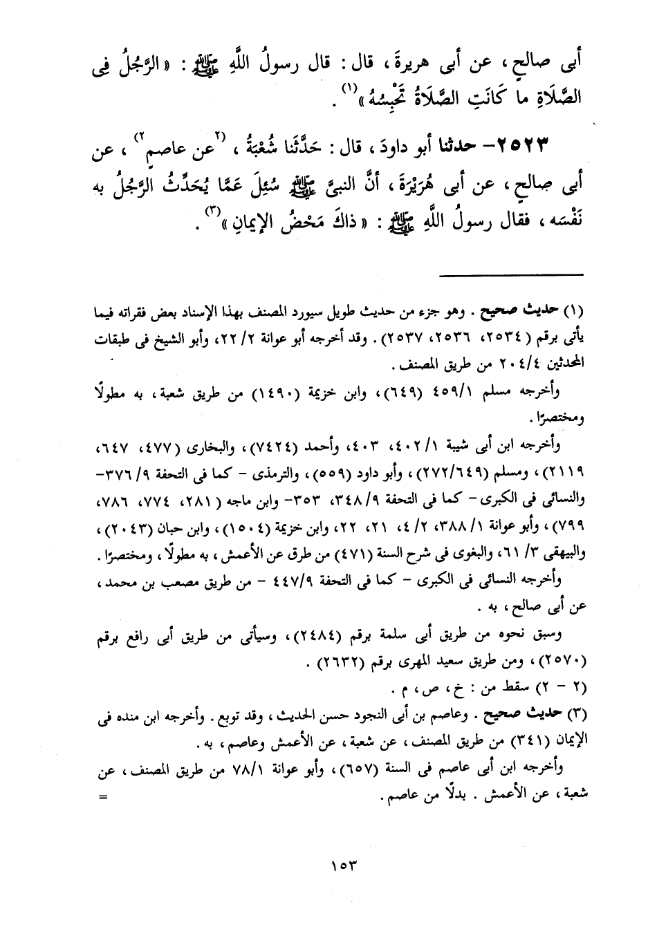 2523 - حَدَّثَنَا أَبُو دَاوُدَ قَالَ: حَدَّثَنَا شُعْبَةُ، عَنْ عَاصِمٍ عَنْ أَبِي صَالِحٍ، عَنْ أَبِي هُرَيْرَةَ، أَنَّ النَّبِيَّ صَلَّى اللهُ عَلَيْهِ وَسَلَّمَ سُئِلَ عَمَّا يُحَدِّثُ الرَّجُلُ بِهِ نَفْسَهُ فَقَالَ رَسُولُ اللَّهِ صَلَّى اللهُ عَلَيْهِ وَسَلَّمَ: «§ذَاكَ مَحْضُ الْإِيمَانِ»