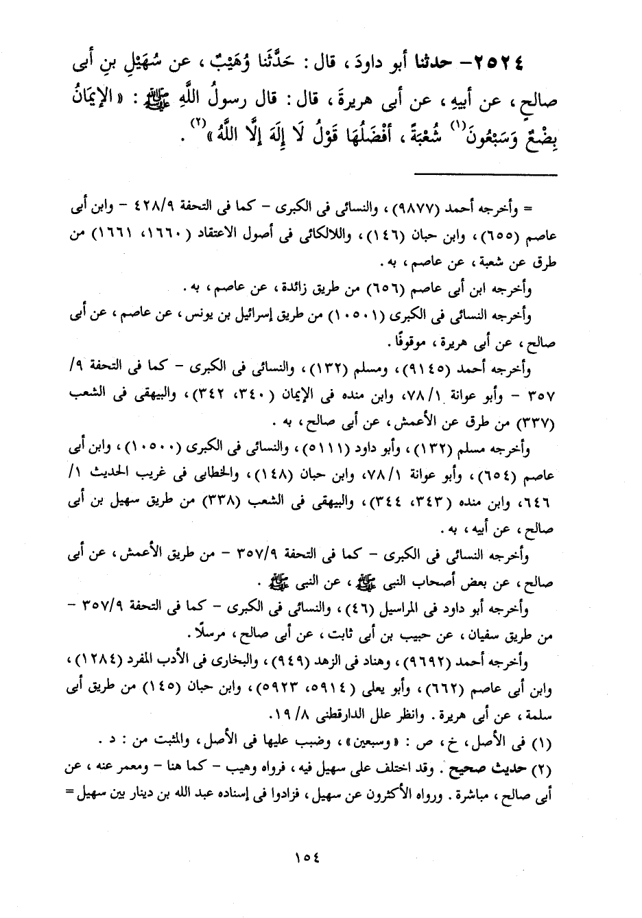 2524 - حَدَّثَنَا أَبُو دَاوُدَ قَالَ: حَدَّثَنَا وُهَيْبٌ، عَنْ سُهَيْلِ بْنِ أَبِي صَالِحٍ، عَنْ أَبِيهِ، عَنْ أَبِي هُرَيْرَةَ، قَالَ: قَالَ رَسُولُ اللَّهِ صَلَّى اللهُ عَلَيْهِ وَسَلَّمَ: «§الْإِيمَانُ بِضْعٌ وَسَبْعُونَ شُعْبَةً، أَفْضَلُهَا قَوْلُ لَا إِلَهَ إِلَّا اللَّهُ»