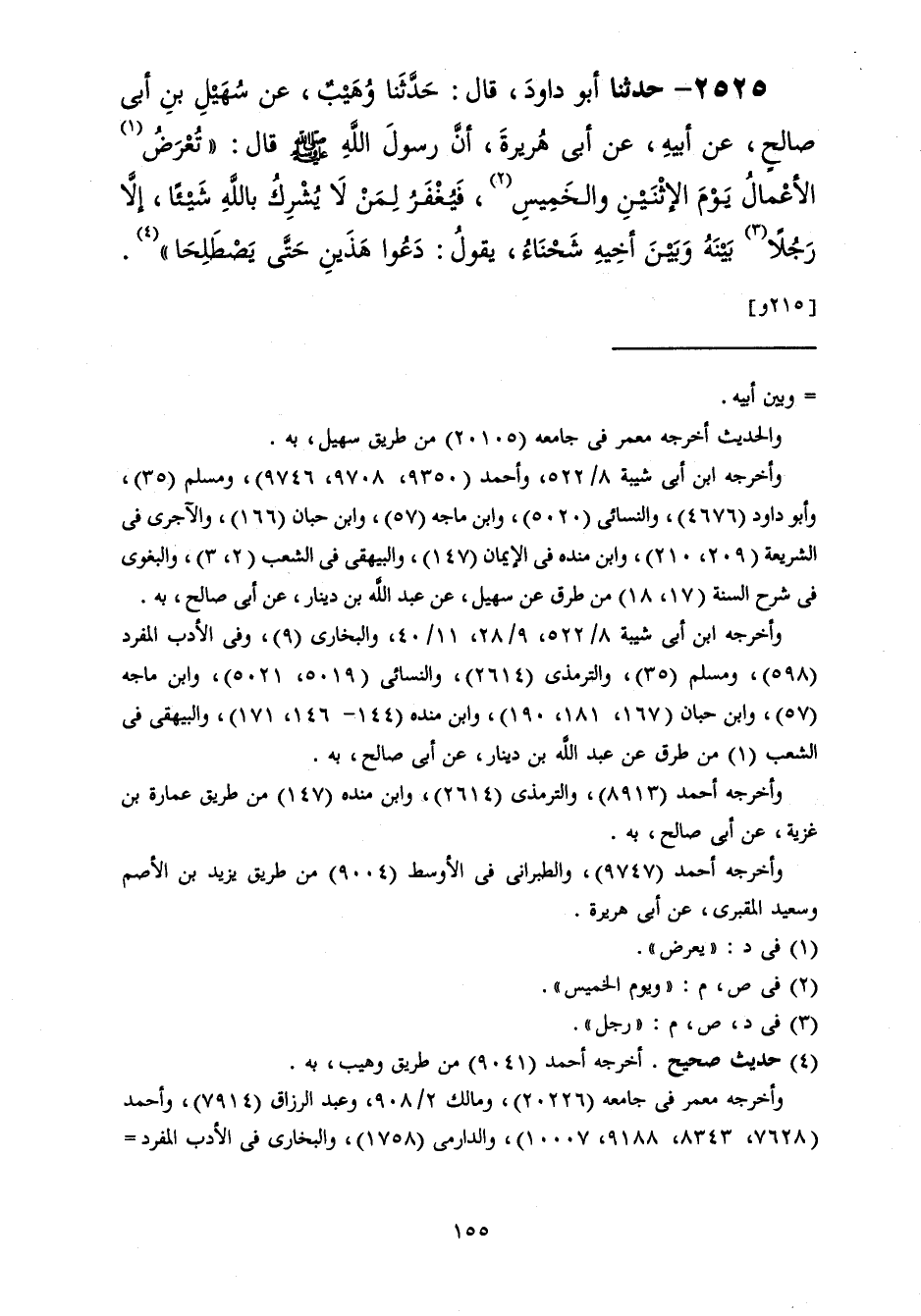 2525 - حَدَّثَنَا أَبُو دَاوُدَ قَالَ: حَدَّثَنَا وُهَيْبٌ، عَنْ سُهَيْلِ بْنِ أَبِي صَالِحٍ، عَنْ أَبِيهِ، عَنْ أَبِي هُرَيْرَةَ، أَنَّ رَسُولَ اللَّهِ صَلَّى اللهُ عَلَيْهِ وَسَلَّمَ قَالَ: " §تُعْرَضُ الْأَعْمَالُ يَوْمَ الِاثْنَيْنِ وَالْخَمِيسِ فَيُغْفَرُ لِمَنْ لَا يُشْرِكُ بِاللَّهِ شَيْئًا، إِلَّا رَجُلًا بَيْنَهُ وَبَيْنَ أَخِيهِ شَحْنَاءُ يَقُولُ: دَعُوا هَذَيْنِ حَتَّى يَصْطَلِحَا "