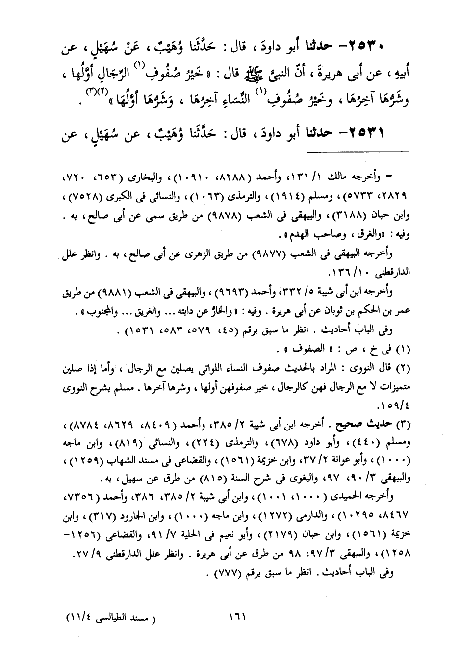 2530 - حَدَّثَنَا أَبُو دَاوُدَ قَالَ: حَدَّثَنَا وُهَيْبٌ، عَنْ سُهَيْلٍ، عَنْ أَبِيهِ، عَنْ أَبِي هُرَيْرَةَ، أَنَّ النَّبِيَّ صَلَّى اللهُ عَلَيْهِ وَسَلَّمَ قَالَ: «§خَيْرُ صُفُوفِ الرِّجَالِ أَوَّلُهَا، وَشَرُّهَا آخِرُهَا، وَخَيْرُ صُفُوفِ النِّسَاءِ آخِرُهَا، وَشَرُّهَا أَوَّلُهَا»