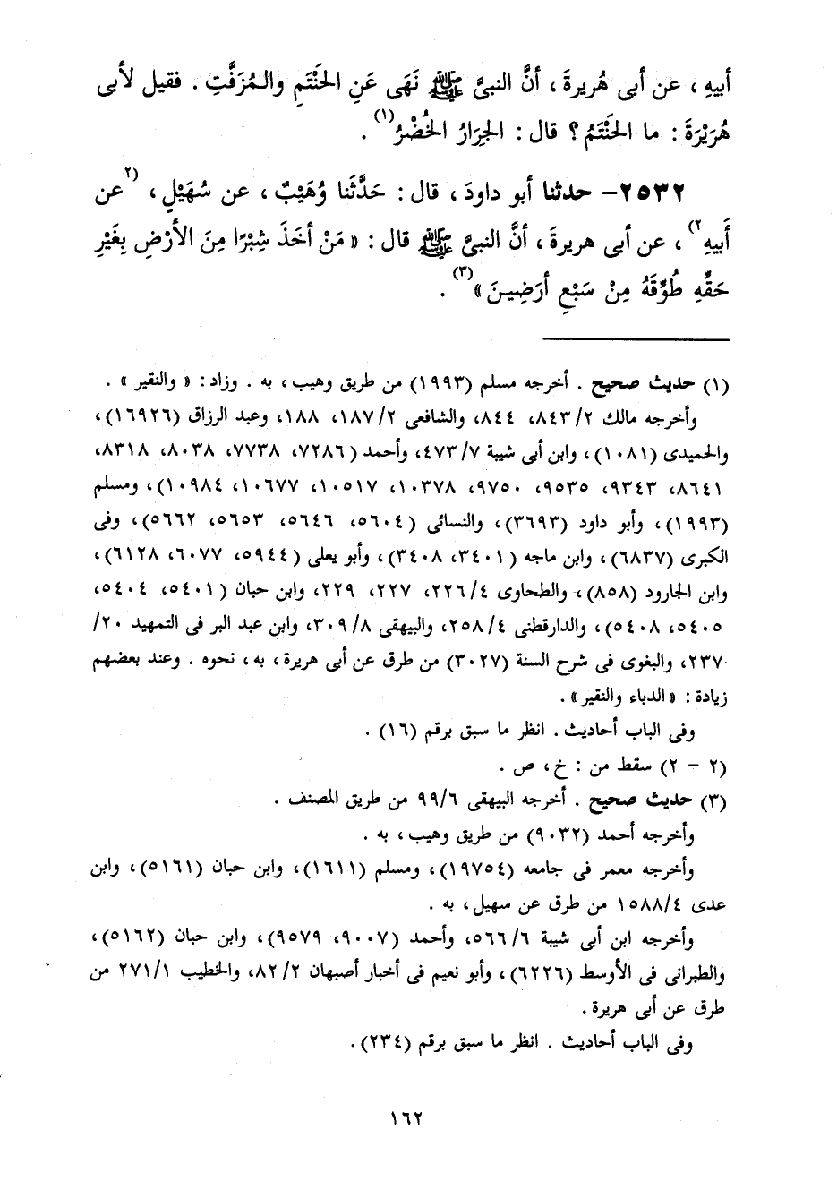 2532 - حَدَّثَنَا أَبُو دَاوُدَ قَالَ: حَدَّثَنَا وُهَيْبٌ، عَنْ سُهَيْلٍ، عَنْ أَبِيهِ، عَنْ أَبِي هُرَيْرَةَ، أَنَّ النَّبِيَّ صَلَّى اللهُ عَلَيْهِ وَسَلَّمَ قَالَ: «§مَنْ أَخَذَ شِبْرًا مِنَ الْأَرْضِ بِغَيْرِ حَقِّهِ طُوِّقَهُ مِنْ سَبْعِ أَرَضِينَ»