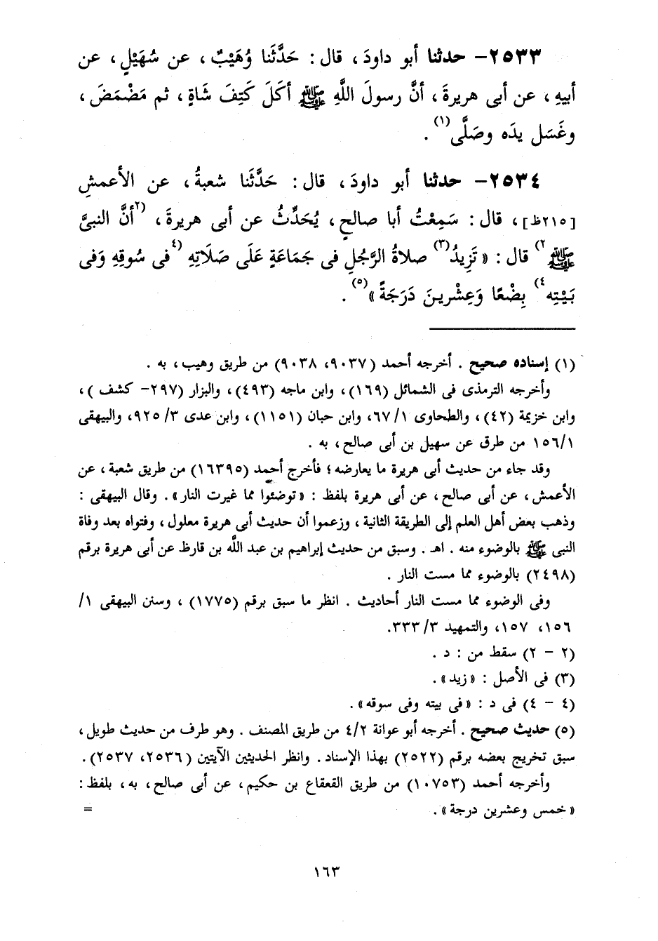 2533 - حَدَّثَنَا أَبُو دَاوُدَ قَالَ: حَدَّثَنَا وُهَيْبٌ، عَنْ سُهَيْلٍ، عَنْ أَبِيهِ، عَنْ أَبِي هُرَيْرَةَ، أَنَّ رَسُولَ اللَّهِ صَلَّى اللهُ عَلَيْهِ وَسَلَّمَ «§أَكَلَ كَتِفَ شَاةٍ ثُمَّ مَضْمَضَ وَغَسَلَ يَدَهُ وَصَلَّى»