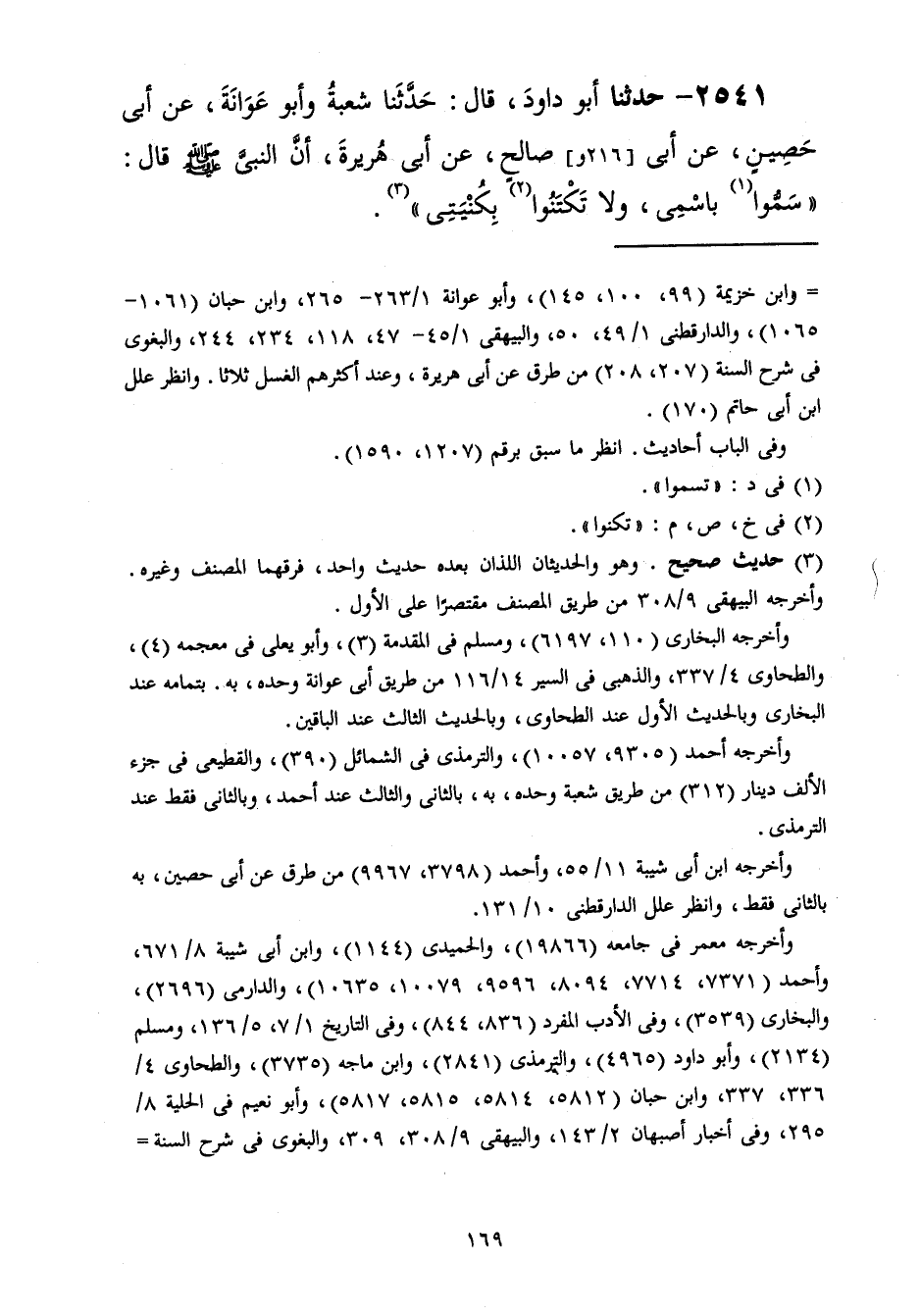 2541 - حَدَّثَنَا أَبُو دَاوُدَ قَالَ: حَدَّثَنَا شُعْبَةُ، وَأَبُو عَوَانَةَ عَنْ أَبِي حُصَيْنٍ، عَنْ أَبِي صَالِحٍ، عَنْ أَبِي هُرَيْرَةَ، أَنَّ النَّبِيَّ صَلَّى اللهُ عَلَيْهِ وَسَلَّمَ قَالَ: «§سَمُّوا بِاسْمِي، وَلَا تَكْتَنُوا بِكُنْيَتِي»
