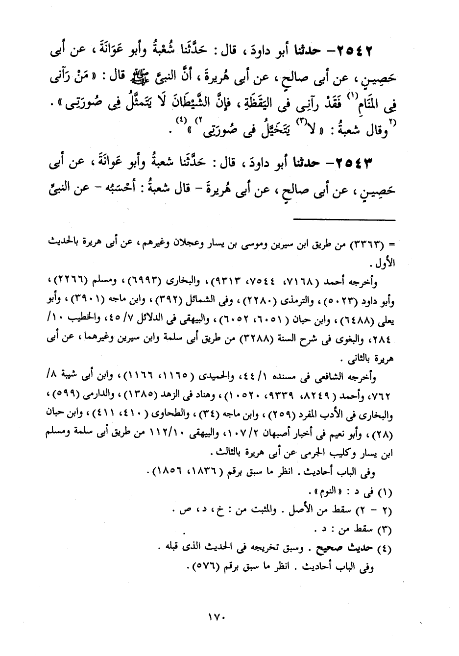 2542 - حَدَّثَنَا أَبُو دَاوُدَ قَالَ: حَدَّثَنَا شُعْبَةُ، وَأَبُو عَوَانَةَ عَنْ أَبِي حُصَيْنٍ، عَنْ أَبِي صَالِحٍ، عَنْ أَبِي هُرَيْرَةَ، أَنَّ النَّبِيَّ صَلَّى اللهُ عَلَيْهِ وَسَلَّمَ قَالَ: «§مَنْ رَآنِي فِي الْمَنَامِ فَقَدْ رَآنِي فِي الْيَقَظَةِ فَإِنَّ الشَّيْطَانَ لَا يَتَمَثَّلُ فِي صُورَتِي» وَقَالَ شُعْبَةُ: «لَا يَتَخَيَّلُ فِي صُورَتِي»