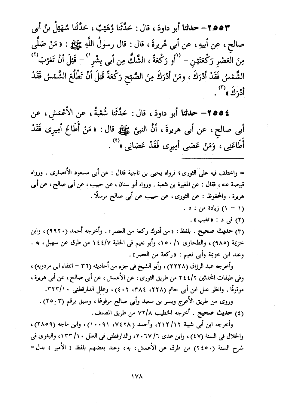 2553 - حَدَّثَنَا أَبُو دَاوُدَ قَالَ: حَدَّثَنَا وُهَيْبٌ، حَدَّثَنَا سُهَيْلُ بْنُ أَبِي صَالِحٍ، عَنْ أَبِيهِ، عَنْ أَبِي هُرَيْرَةَ، قَالَ: قَالَ رَسُولُ اللَّهِ صَلَّى اللهُ عَلَيْهِ وَسَلَّمَ: «§مَنْ صَلَّى مِنَ الْعَصْرَ رَكْعَتَيْنِ أَوْ رَكْعَةً، الشَّكُّ مِنْ أَبِي بِشْرٍ قَبْلَ أَنْ تَغْرُبَ الشَّمْسُ فَقَدْ أَدْرَكَ، وَمَنْ أَدْرَكَ مِنَ الصُّبْحِ رَكْعَةً قَبْلَ أَنْ تَطْلُعَ الشَّمْسُ فَقَدْ أَدْرَكَ»
