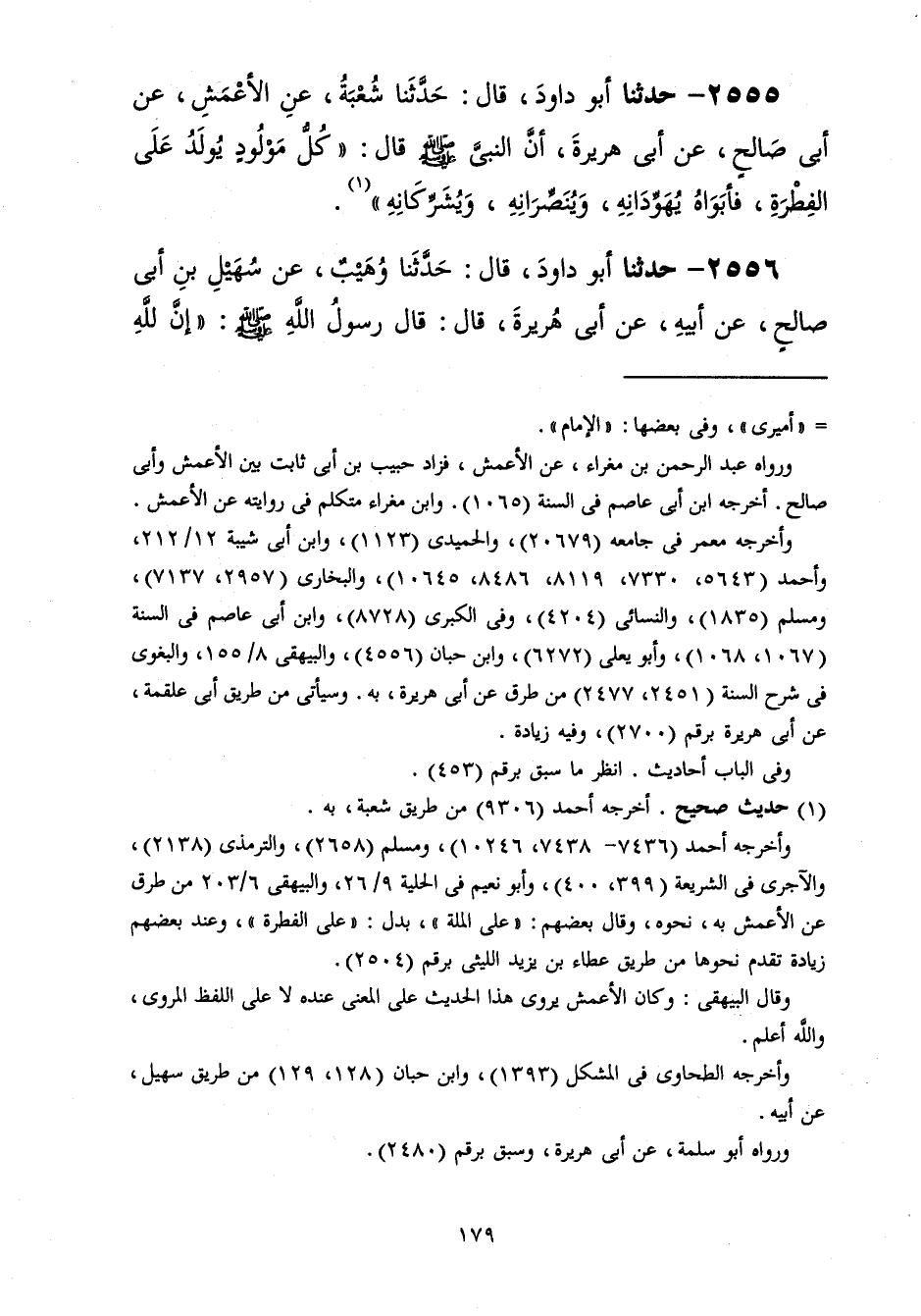 2555 - حَدَّثَنَا أَبُو دَاوُدَ قَالَ: حَدَّثَنَا شُعْبَةُ، عَنِ الْأَعْمَشِ، عَنْ أَبِي صَالِحٍ، عَنْ أَبِي هُرَيْرَةَ، أَنَّ النَّبِيَّ صَلَّى اللهُ عَلَيْهِ وَسَلَّمَ قَالَ: «§كُلُّ مَوْلُودٍ يُولَدُ عَلَى الْفِطْرَةِ فَأَبَوَاهُ يُهَوِّدَانِهِ وَيُنَصِّرَانِهِ وَيُشَرِّكَانِهِ»