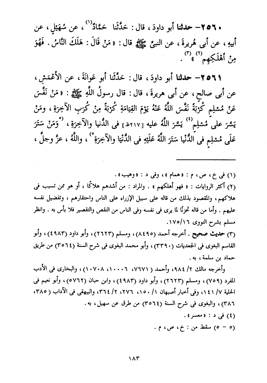 2561 - حَدَّثَنَا أَبُو دَاوُدَ قَالَ: حَدَّثَنَا أَبُو عَوَانَةَ، عَنِ الْأَعْمَشِ، عَنْ أَبِي صَالِحٍ، عَنْ أَبِي هُرَيْرَةَ، قَالَ: قَالَ رَسُولُ اللَّهِ صَلَّى اللهُ عَلَيْهِ وَسَلَّمَ: «§مَنْ نَفَّسَ عَنْ مُسْلِمٍ كُرْبَةً نَفَّسَ اللَّهُ عَنْهُ يَوْمَ الْقِيَامَةِ كُرْبَةً مِنْ كُرَبِ الْآخِرَةِ وَمَنْ يَسَّرَ عَلَى مُسْلِمٍ يَسَّرَ اللَّهُ عَلَيْهِ فِي الدُّنْيَا وَالْآخِرَةِ، وَمَنْ سَتَرَ عَلَى مُسْلِمٍ فِي الدُّنْيَا سَتَرَ اللَّهُ عَلَيْهِ فِي الدُّنْيَا وَالْآخِرَةِ، وَاللَّهُ عَزَّ وَجَلَّ -[184]- فِي عَوْنِ الْعَبْدِ مَا كَانَ فِي عَوْنِ أَخِيهِ»