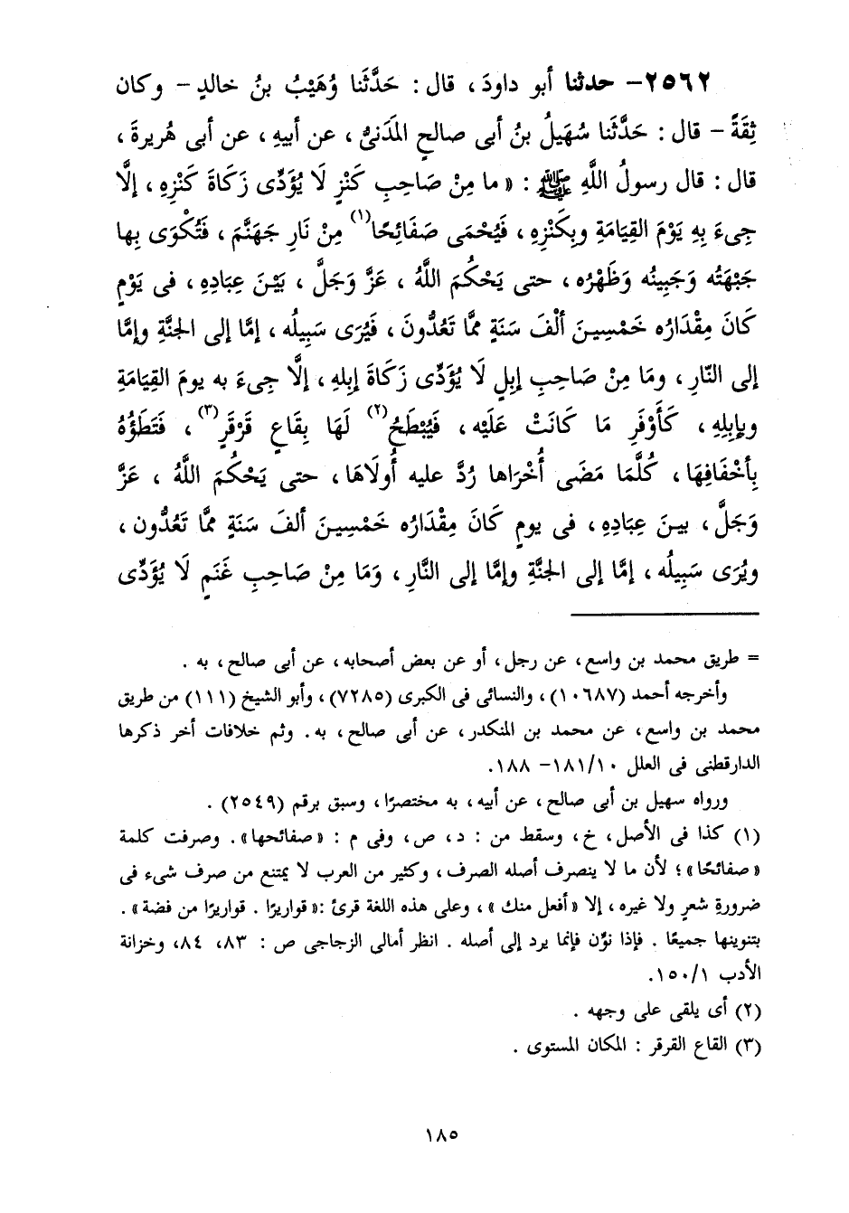 2562 - حَدَّثَنَا أَبُو دَاوُدَ قَالَ: حَدَّثَنَا وُهَيْبُ بْنُ خَالِدٍ، وَكَانَ ثِقَةً قَالَ: حَدَّثَنَا سُهَيْلُ بْنُ أَبِي صَالِحٍ الْمَدَنِيُّ، عَنْ أَبِيهِ، عَنْ أَبِي هُرَيْرَةَ، قَالَ: قَالَ رَسُولُ اللَّهِ صَلَّى اللهُ عَلَيْهِ وَسَلَّمَ: «§مَا مِنْ صَاحِبِ كَنْزٍ لَا يُؤَدِّي زَكَاةَ كَنْزِهِ إِلَّا جِيءَ بِهِ يَوْمَ الْقِيَامَةِ وَبِكَنْزِهِ فَيُحْمَى صَفَائِحًا مِنْ نَارِ جَهَنَّمَ فَتُكْوَى بِهَا جَبْهَتُهُ وَجَبِينُهُ وَظَهْرُهُ حَتَّى يَحْكُمَ اللَّهُ عَزَّ وَجَلَّ بَيْنَ عِبَادِهِ فِي يَوْمٍ كَانَ مِقْدَارُهُ خَمْسِينَ أَلْفَ سَنَةٍ مِمَّا تَعُدُّونَ، فَيُرَى سَبِيلُهُ إِمَّا إِلَى الْجَنَّةِ وَإِمَّا إِلَى النَّارِ وَمَا مِنْ صَاحِبِ إِبِلٍ لَا يُؤَدِّي زَكَاةَ إِبِلِهِ إِلَّا جِيءَ بِهِ يَوْمَ الْقِيَامَةِ وَبِإِبِلِهِ كَأَوْفَرِ مَا كَانَتْ عَلَيْهِ، فَيُبْطَحُ لَهَا بِقَاعٍ قَرْقَرٍ، فَتَطَؤُهُ بِأَخْفَافِهَا، كُلَّمَا مَضَى أُخْرَاهَا رُدَّ عَلَيْهِ أُولَاهَا، حَتَّى يَحْكُمَ اللَّهُ عَزَّ وَجَلَّ بَيْنَ عِبَادِهِ فِي يَوْمٍ كَانَ مِقْدَارُهُ خَمْسِينَ أَلْفَ سَنَةٍ مِمَّا تَعُدُّونَ، وَيُرَى سَبِيلُهُ إِمَّا إِلَى الْجَنَّةِ وَإِمَّا إِلَى النَّارِ وَمَا مِنْ صَاحِبِ غَنَمٍ لَا يُؤَدِّي -[186]- زَكَاةَ غَنَمِهِ إِلَّا جِيءَ بِهِ يَوْمَ الْقِيَامَةِ وَبِغَنَمِهِ كَأَوْفَرِ مَا كَانَتْ عَلَيْهِ، فَيُبْطَحُ لَهَا بِقَاعٍ قَرْقَرٍ، فَتَنْطَحُهُ بِقُرُونِهَا وَتَطُؤُهُ بِأَظْلَافِهَا، كُلَّمَا مَضَى أُخْرَاهَا رُدَّ عَلَيْهِ أُولَاهَا، حَتَّى يَحْكُمَ اللَّهُ عَزَّ وَجَلَّ بَيْنَ عِبَادِهِ فِي يَوْمٍ كَانَ مِقْدَارُهُ خَمْسِينَ أَلْفَ سَنَةٍ مِمَّا تَعُدُّونَ، فَيُرَى سَبِيلُهُ إِمَّا إِلَى الْجَنَّةِ وَإِمَّا إِلَى النَّارِ» قِيلَ: يَا رَسُولَ اللَّهِ، فَالْخَيْلُ؟، قَالَ: " الْخَيْلُ مَعْقُودٌ فِي نَوَاصِيهَا الْخَيْرُ إِلَى يَوْمِ الْقِيَامَةِ فَالْخَيْلُ ثَلَاثَةٌ: فَهِيَ لِرَجُلٍ أَجْرٌ، وَلِرَجُلٍ سِتْرٌ، وَعَلَى آخَرَ وِزْرٌ فَأَمَّا الَّذِي هِيَ لَهُ أَجْرٌ فَرَجُلٌ يَتَّخِذُهَا فَيَحْبِسُهَا فِي سَبِيلِ اللَّهِ عَزَّ وَجَلَّ، فَمَا غَيَّبَتْ فِي بُطُونِهَا فَلَهُ أَجْرٌ، وَلَوْ رَعَاهَا فِي مَرْجٍ فَأَطَالَ لَهَا كَانَ لَهُ بِكُلِّ مَا غَيَّبَتْ فِي بُطُونِهَا أَجْرٌ، وَلَوِ اسْتَنَّتْ شَرَفًا أَوْ شَرَفَيْنِ كَانَ لَهُ بِكُلِّ خُطْوَةٍ خَطَتْهَا أَوْ أَخْطَاهَا أَجْرٌ، وَلَوْ مَرَّ بِهَا عَلَى نَهَرٍ فَسَقَاهَا مِنْهُ كَانَ لَهُ بِكُلِّ قَطْرَةٍ غَيَّبَتْ فِي بُطُونِهَا أَجْرٌ «حَتَّى ذَكَرَ الْأَجْرَ فِي أَرْوَاثِهَا وَأَبْوَالِهَا» وَأَمَّا الَّتِي هِيَ لَهُ سِتْرٌ فَرَجُلٌ اتَّخَذَهَا تَعَفُّفًا وَتَكَرُّمًا وَتَجَمُّلًا، وَلَا يَنْسَى حَقَّهَا فِي ظُهُورِهَا وَبُطُونِهَا، وَفِي عُسْرِهَا وَيُسْرِهَا، وَأَمَّا الَّتِي عَلَيْهِ وِزْرٌ فَرَجُلٌ اتَّخَذَهَا أَشَرًا وَبَطَرًا وَرِيَاءً النَّاسِ " قِيلَ: يَا رَسُولَ اللَّهِ، مَا تَقُولُ فِي الْحُمُرِ؟، قَالَ: " مَا نَزَلَ عَلَيَّ فِيهِ إِلَّا هَذِهِ الْآيَةُ الْجَامِعَةُ: {فَمَنْ يَعْمَلْ مِثْقَالَ ذَرَّةٍ خَيْرًا يَرَهُ، وَمَنْ -[187]- يَعْمَلْ مِثْقَالَ ذَرَّةٍ شَرًّا يَرَهُ} [الزلزلة: 8] "